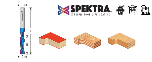 Spiral-flute bits combine a shearing action in cutting with an augering action in chip clearance. The shearing action yields an especially clean accurate cut while the augering action clears chips from the cut.The Down-Cut cuts from the surface down leaving a smooth edge at the surface.Special unique carbide grade increased clearance geometry and razor-sharp cutting edges with polished flutes provide a superior finish and longer tool life especially in abrasive materials. Great for production settings and excellent for creating grooves and dado cuts in particleboard, plywood and laminate. Primarily used on CNC machines and other automatic routers. Can be used with handheld and table-mounted portable routers.