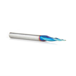 Specially designed for 2D and 3D CNC profiling and carving in plastic wood with CNC machines. The high-shear ball nose tips cut smooth 2D and 3D contours with reduced stepping while the proprietary Spektra coating (applied by the physical vapor deposition coating process) provides high resistance to wear, sharper cutting edges, extended tool life and less friction and heat buildup. Some of Amana Tool carving tools, as you can appreciate have a very small diameter therefore any material chip-loads need to reflect that small size. It can however withstand RPMs up to 60,000 RPMs. A directed air-blast to keep chips away along with cooling the tool and work piece are always welcome.