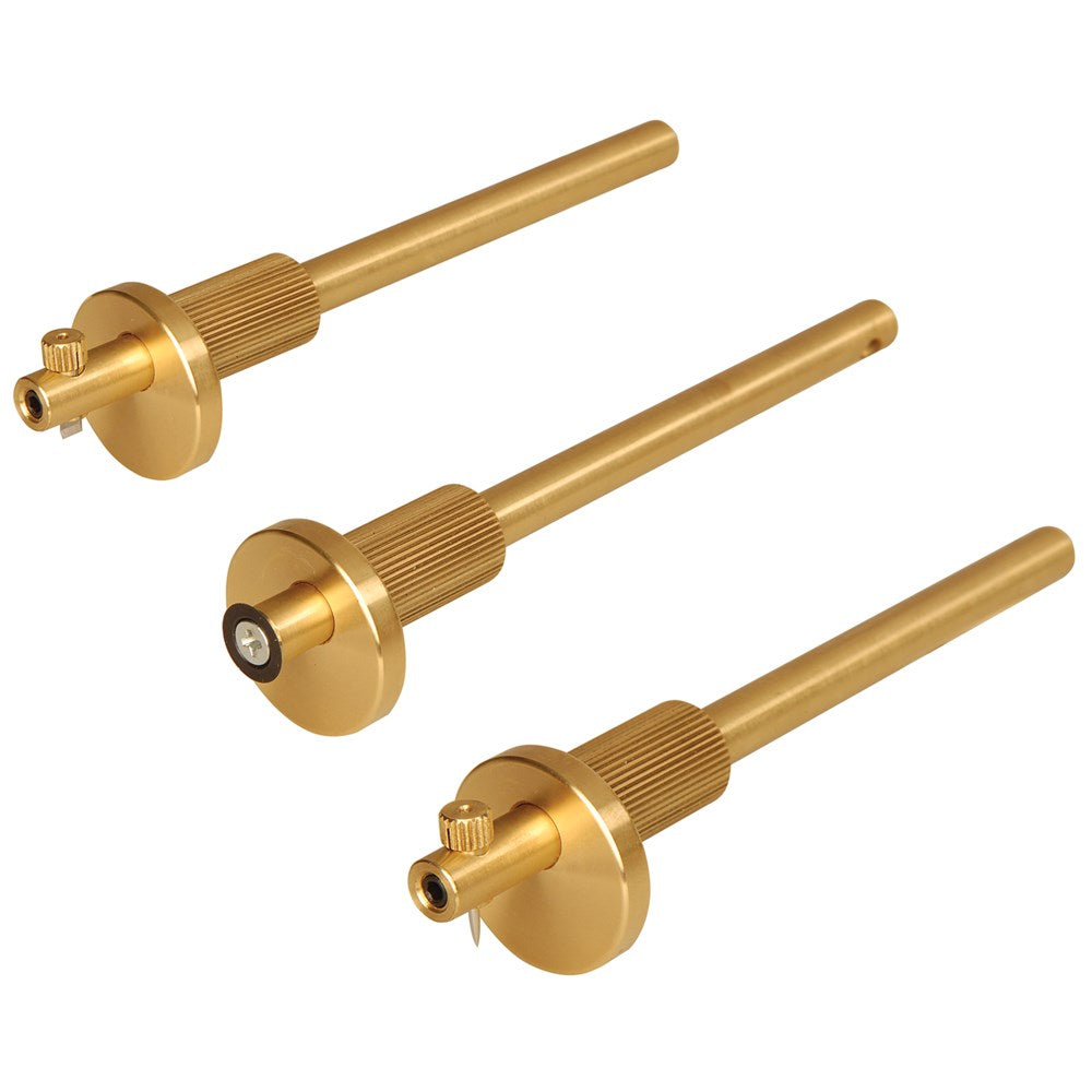 The unique swivelling pin/blade chuck takes either a pin or a blade that locks in place (after extension is set) using a set screw in the end of the 4 1/2" gauge stem. The cutting blade can be set for either right- or left-handed use. The opposite end of the stem is tapped to accept a 3/8" diameter wheel cutter.