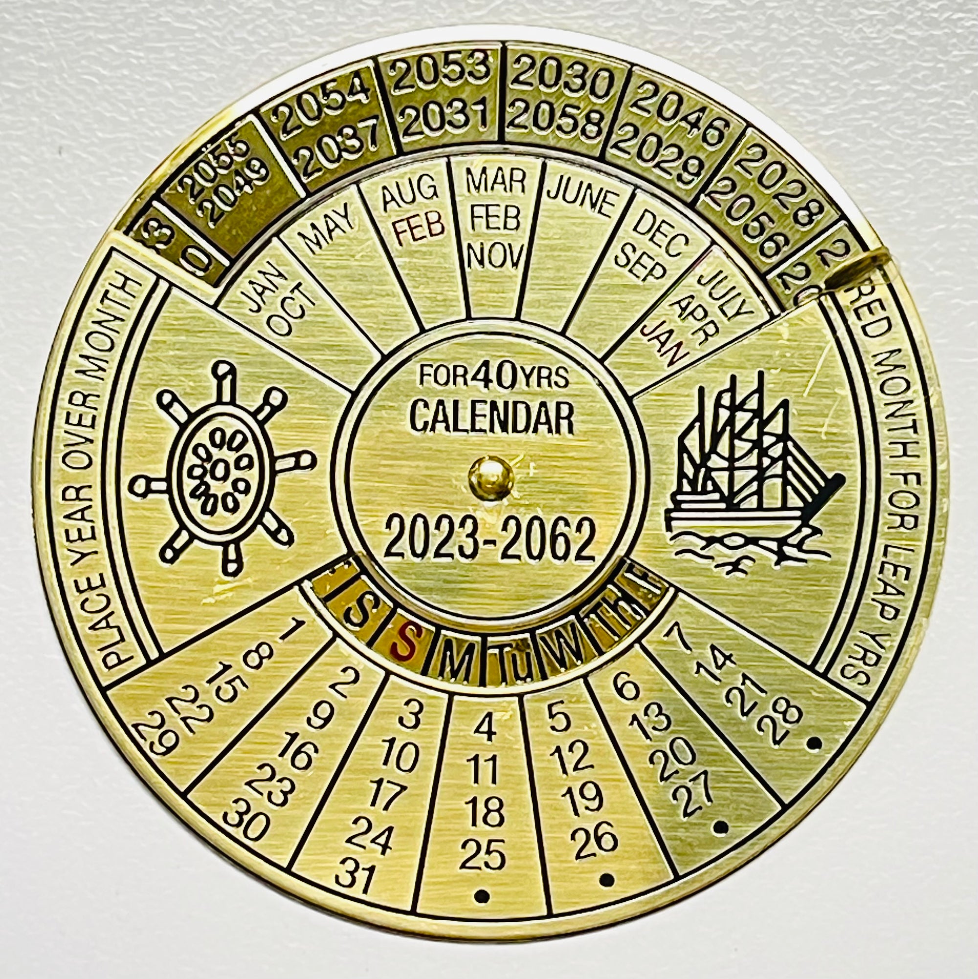 A high-quality nautical brass 40-year Calendar, 2,023 - 2,062. Features dials which are spun around to establish the correct day and date up until 2,062! Sleek, stylish and functional. This is a classic piece that can be turned into a timeless key fob, desk ornament or unique keepsake. Try your hand at creating something with timber, acrylic, resin, or even a combination of materials - the opportunities are limited only by the imagination! Solid brass; 63 mm diameter.