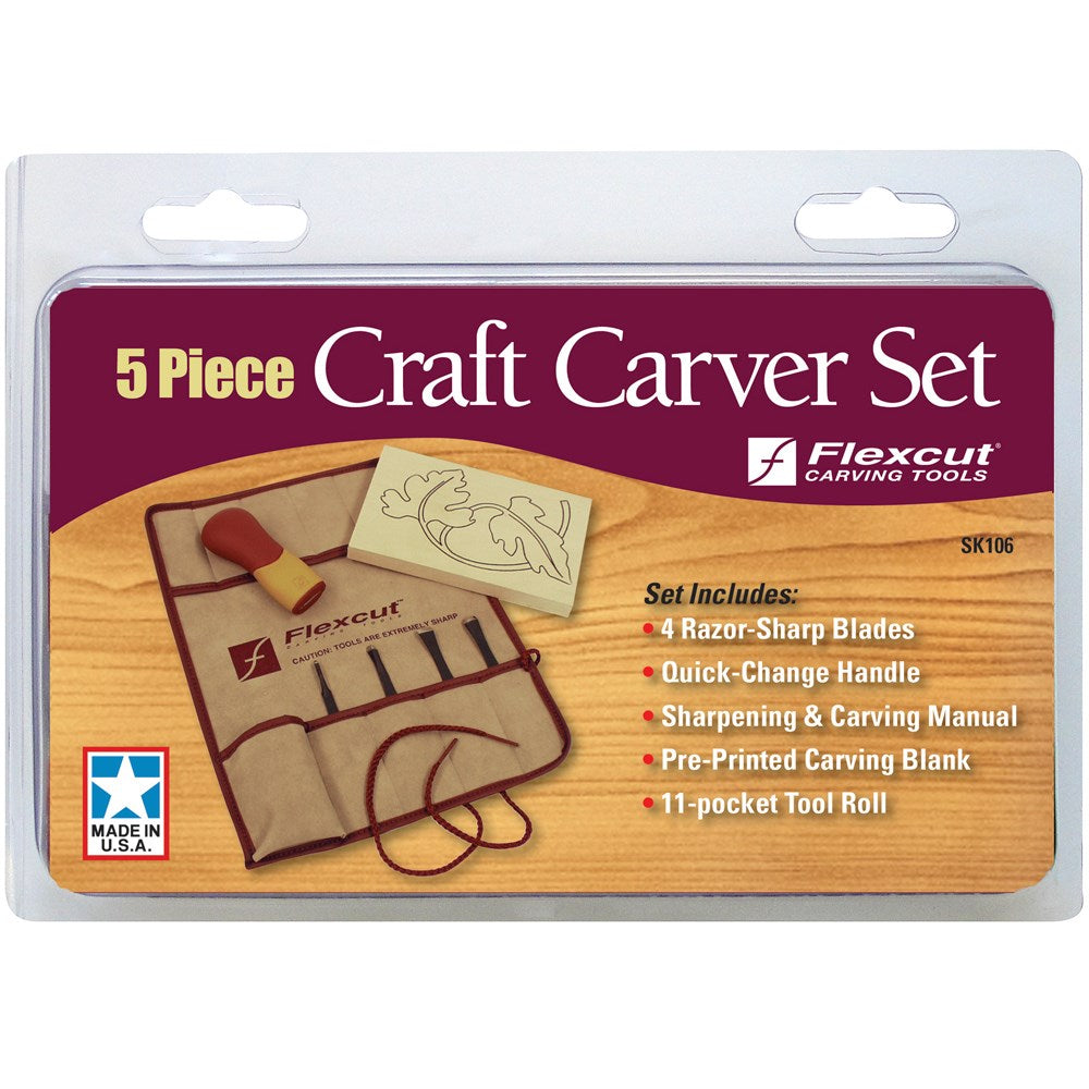 Our 5-Piece Craft Carver Set comes with four carving blades, a quick connect ABS handle, leaf project carving blank, and an 11-pocket tool roll. An owner's manual is also included with step-by-step instructions for completing the project. Profiles included: