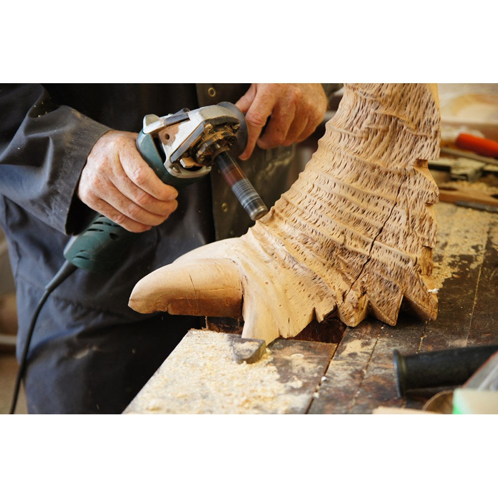 Arbortech's TURBO Shaft has revolutionized power carving and sculpting in timber. Designed to attach to most standard 100mm (4") or 115mm (4½") grinders with an M14 spindle thread (M10 requires an adaptor kit sold separately), this tool quickly removes waste material while leaving your masterpiece intact. Perfect for both freehand and template work, it is ideal for roughing out shapes before finishing with traditional tools, or completing projects entirely with the TURBO Shaft.