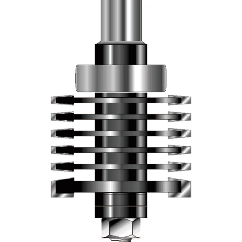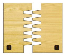 This professional bit features 6 individual cutters and spacers, allowing you to adjust the finger profile to suit your project. Used for very strong edge-to-edge or end-to-end gluing. Used in a router table, the bearing is set flush with the fence.