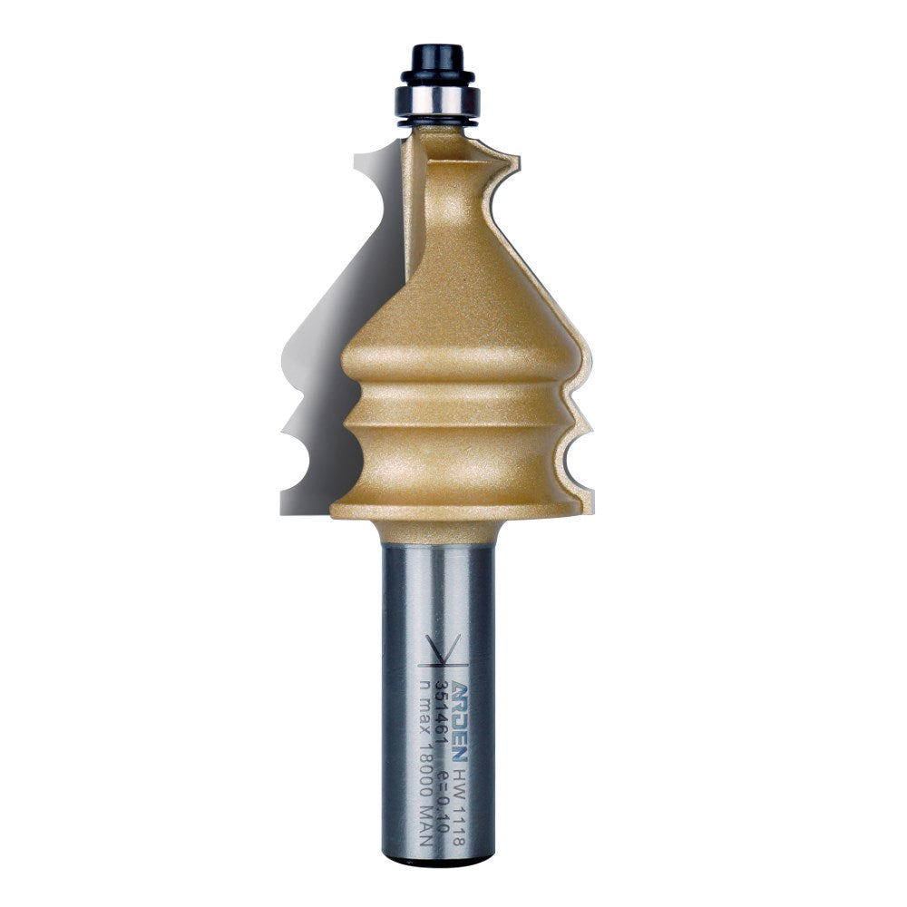 Two flute decorative moulding bit to create detail or decorative accents and feature mouldings. The included bearing allows this bit to be used in a router hand held, though will most likely be used in a router table due to the type and size of work pieces.