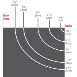 The width of the blade, which is measured from the back of the blade to the tip of the teeth, will determine the radius the blade is capable of cutting, the smaller the blade means the tighter the radius possible. Likewise, the larger the size, the more it is designed for ripping in straight lines and less capable of cutting arcs and curves, to the point where only straight cutting will be done.