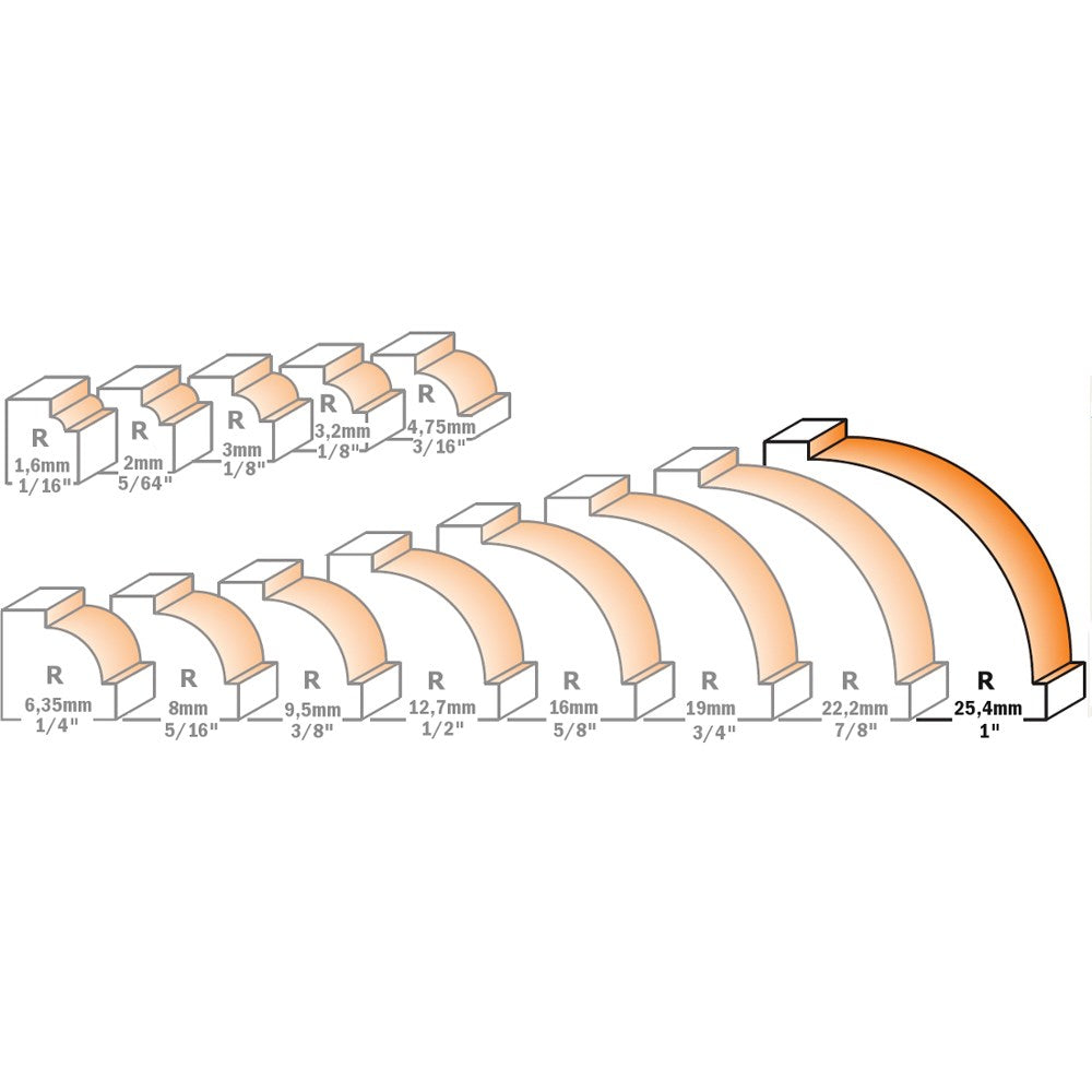The CMT beading bit uses a smaller bearing than a round over bit to produce an extra inset bead along the lower edge of the cut, to create a detail otherwise not achieved with a standard round over bit.