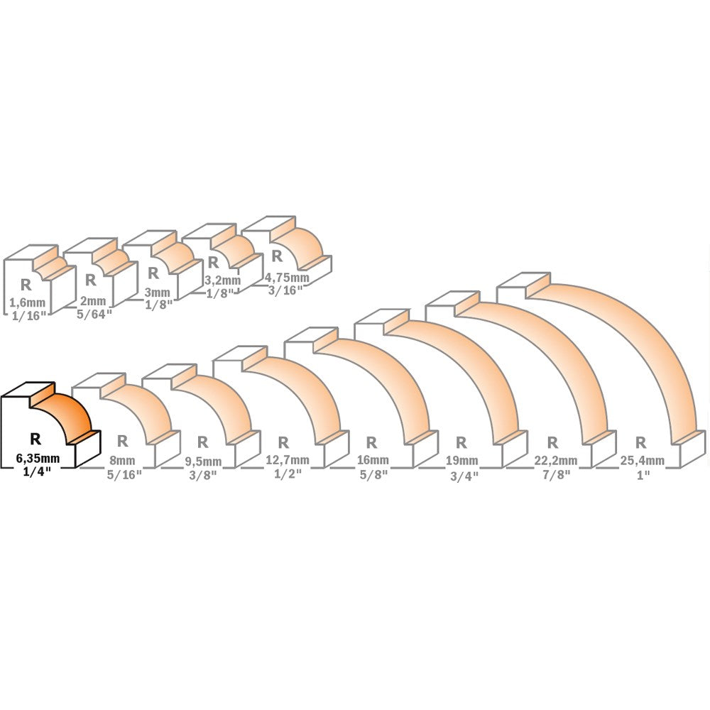 The CMT beading bit uses a smaller bearing than a round over bit to produce an extra inset bead along the lower edge of the cut, to create a detail otherwise not achieved with a standard round over bit.