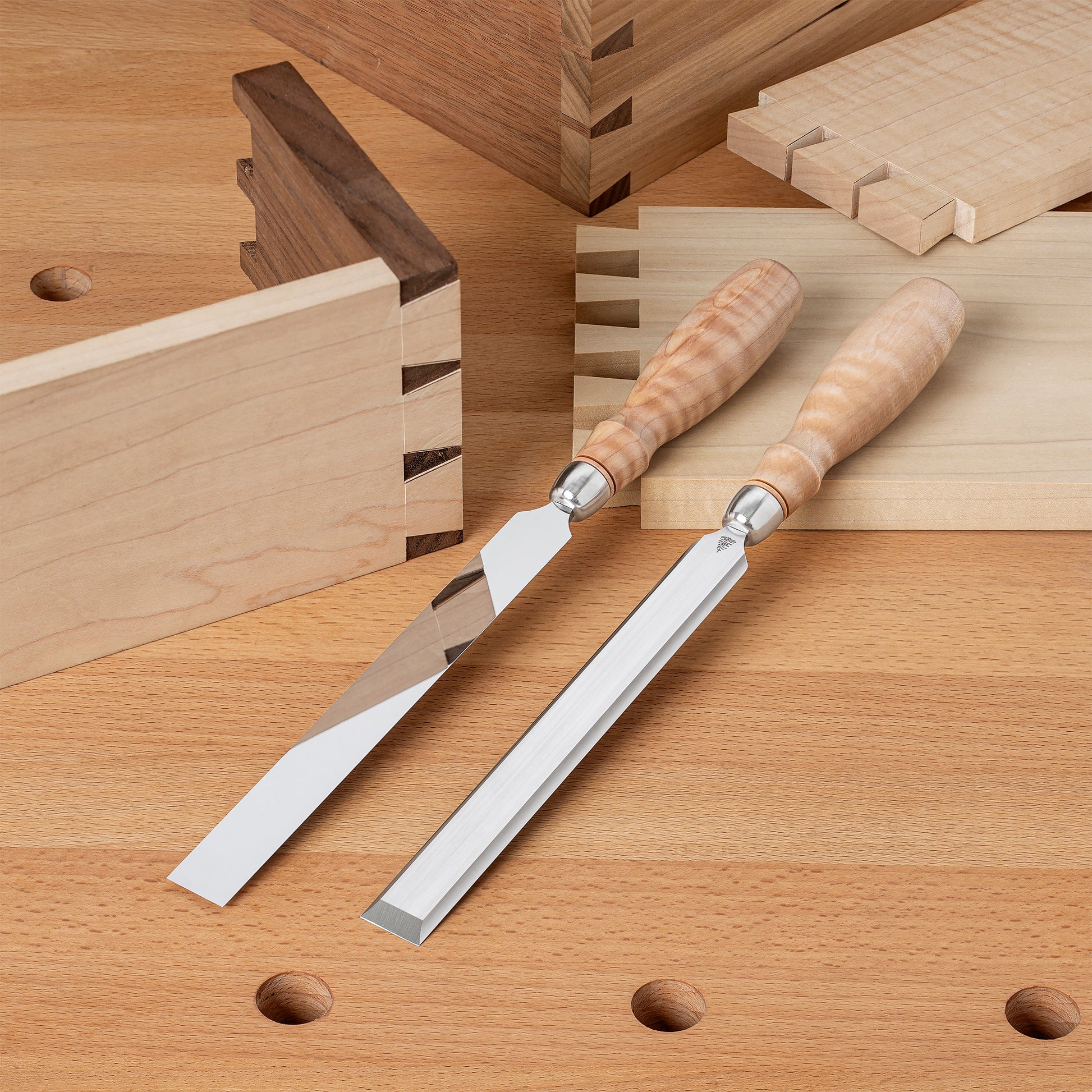 The Optima Paring Chisels from Blue Spruce Toolworks, are essential for finishing touches on your woodworking projects. These thin, flat, and long chisels are perfect for shaving tenons and dowels flush, and trimming dovetails and box joints true and level. The 171 mm blade provides excellent control and balance, while the concave side bevels allow access to tight corners.Each chisel features a lapped and polished back, ensuring unmatched edge sharpness. Made from A2 tool steel, they are double-tempered and cryogenically treated for exceptional edge retention. The chisels are razor sharp and ready to use straight out of the box, with no need for additional sharpening.The Resin-Infused Figured Maple handle fits comfortably in most hands. These chisels are a versatile addition to any woodworker's toolkit.
