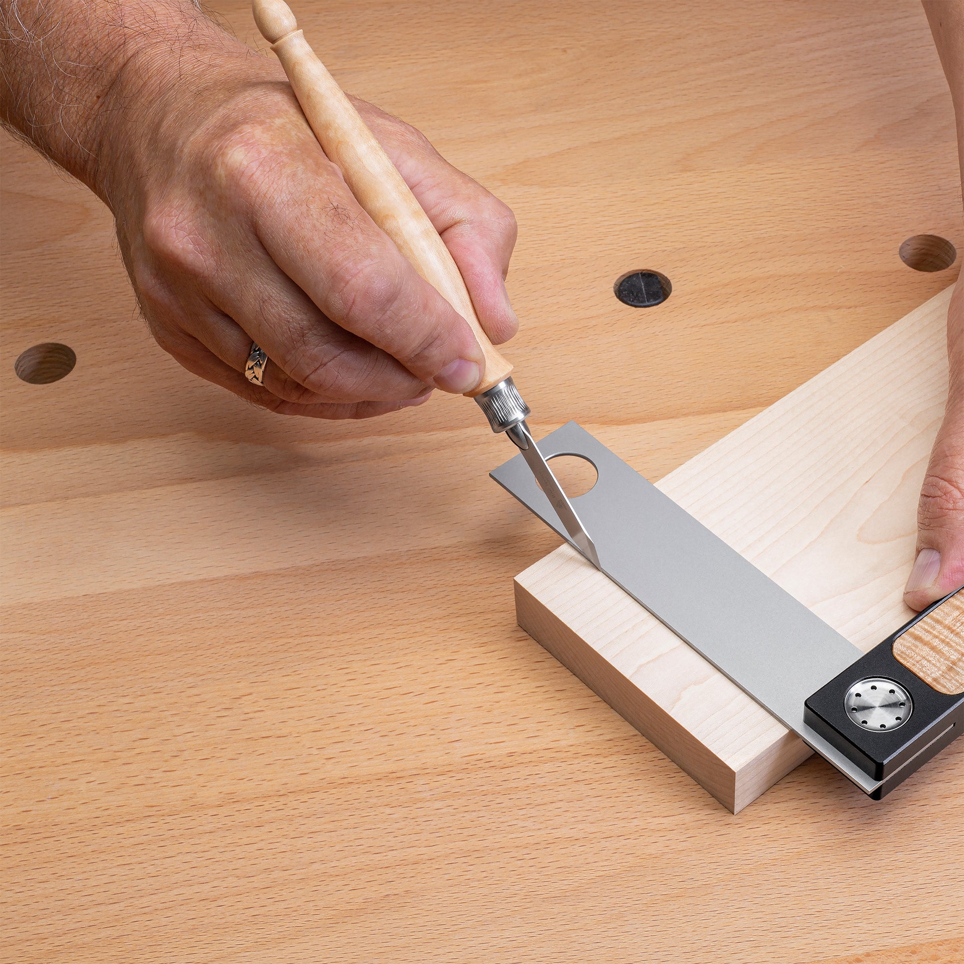 Upgrade your hand-cut joinery with the Blue Spruce Toolworks Classic Marking Knife. Unlike a pencil, this marking knife creates a physical impression in the wood, guiding your saw or chisel for precise cuts. The comfortable, contoured handle in Resin-Infused Curly Maple houses a 0.8 mm blade secured by a tool-less collet system. This allows for quick blade changes, so you can maintain a sharp edge without interrupting your workflow.The spear-point blade design works equally well on both sides; simply flip the knife to place the flat side against your square or straight-edge. The bevel ensures perfect alignment with your reference mark. The Classic Marking Knife is compatible with the entire range of Blue Spruce Toolworks Marking System blades and collets, making it a versatile addition to your toolkit.