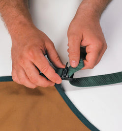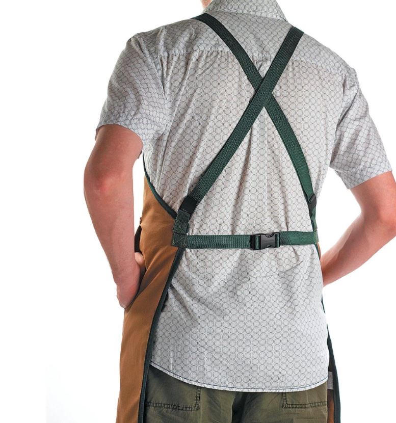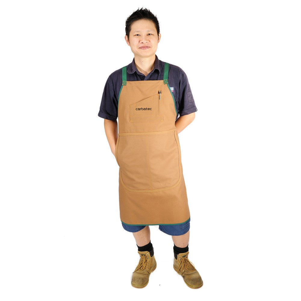 The cross-back shoulder designed straps assist in preventing neck strain, the Veritas apron is made from tan coloured 100% cotton canvas, a washable material that is lightweight yet strong, and features the Carbatec logo. At about 860 mm long by 710 mm wide, it provides the wearer with plenty of side and front coverage. The adjustable shoulder straps secure with low profile clips, and the adjustable waistband has a quick release buckle to aid with fitting. A total of five pockets for pencils etc, and three in the top and two at waist height for larger and heavier items. The lower pockets have side ports for easy access and to help keep out dust and chips, and their angled inside corners don't trap small objects. Made in Canada. Embroidered with Carbatec logo.