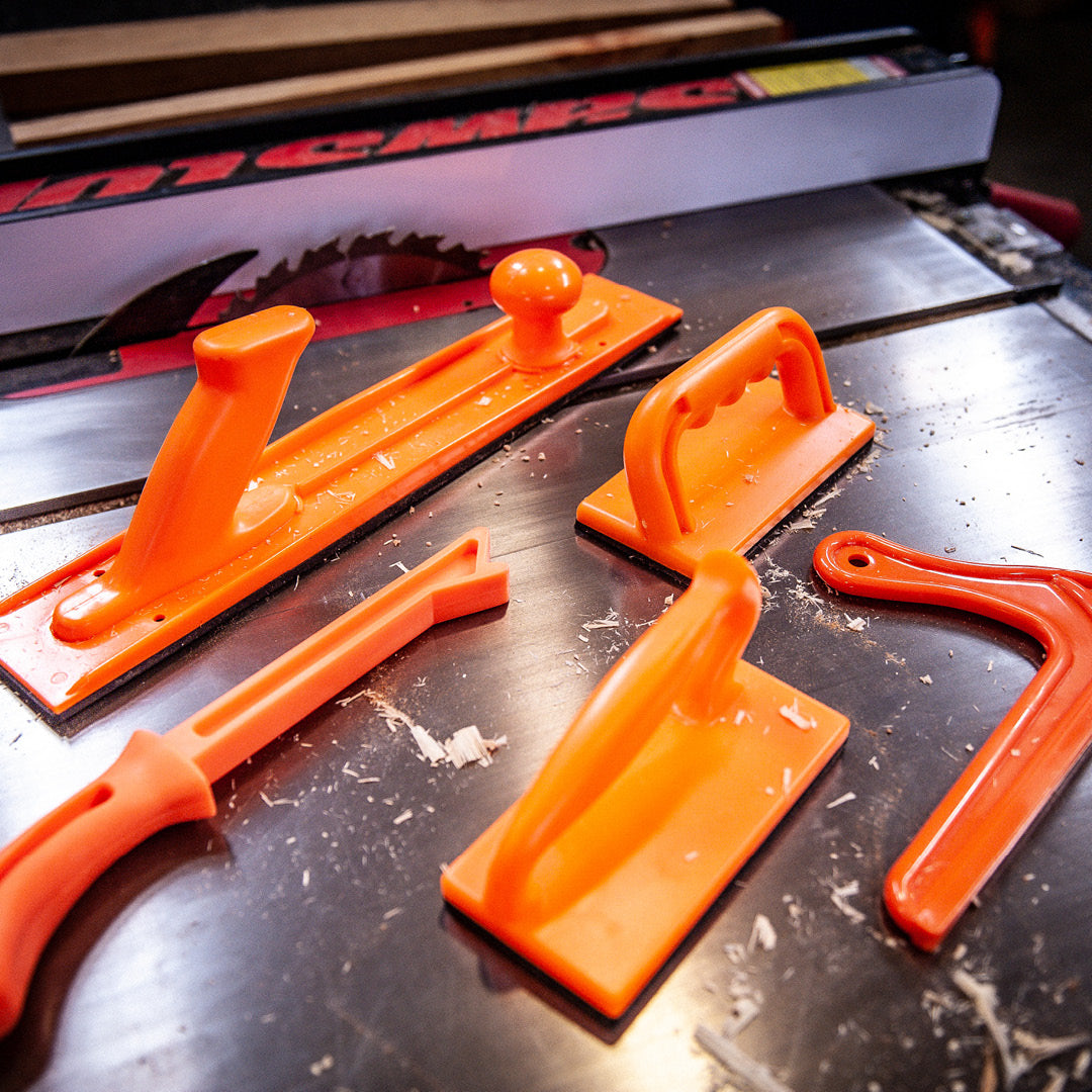 Two separate neoprene faced push blocks, with different handgrips and offsets, for different applications and perfect on Bandsaws, Table Saws and Jointers. The two-handed push block is great on the table sawTraditional handled push stick for general useThin rip push stick where blade and fence are closePlastic construction makes them non-marring and non-damaging