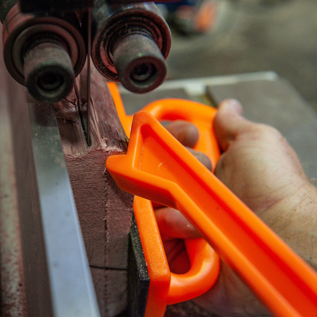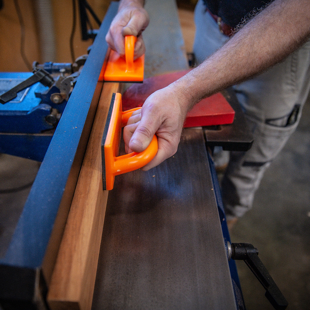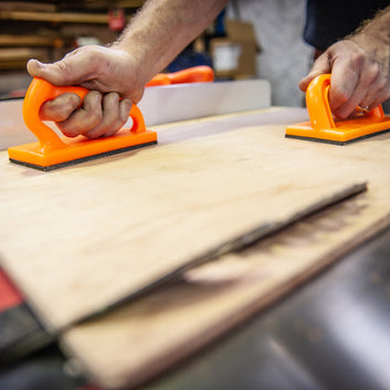 An important woodworking rule is to keep your hands well away from a moving blade, is the easiest way to avoid an accident and costs nothing. It's one of the first things that you learn about, and unfortunately, it one of the last things you forget to do, immediately before and accident. That said, there are occasions where the need to safely support and control your workpiece, and specifically when the need to get 'up close and personal' to the moving steel cannot be avoided. Controlling smaller sheet products requires good downward pressure on a table saw, where very thin rip cuts can leave a projectile jammed between your blade and fence (unless it's pushed past the danger zone). Consistent pressure against a fence on a bandsaw and jointer, ensures a square cut, as does consistent downward pressure on the flat face of a jointer, when flattening a board. Pushing any product through a blade needs carful thought and safety measures (one slip could change your life forever) The Carbatec Push Block & Stick Pack includes 5 various blush blocks and sticks, for almost every occasion. Two separate neoprene faced push blocks, with different handgrips and offsets, for different applications and perfect on Bandsaws, Table Saws and Jointers. The two-handed push block is great on the table saw too. Traditional handled push stick for general use, and a thin rip push stick for those tricky operations where blade and fence are close. Their plastic construction makes them non-marring and non-damaging to your blades (just think… that could have been your finger!)
