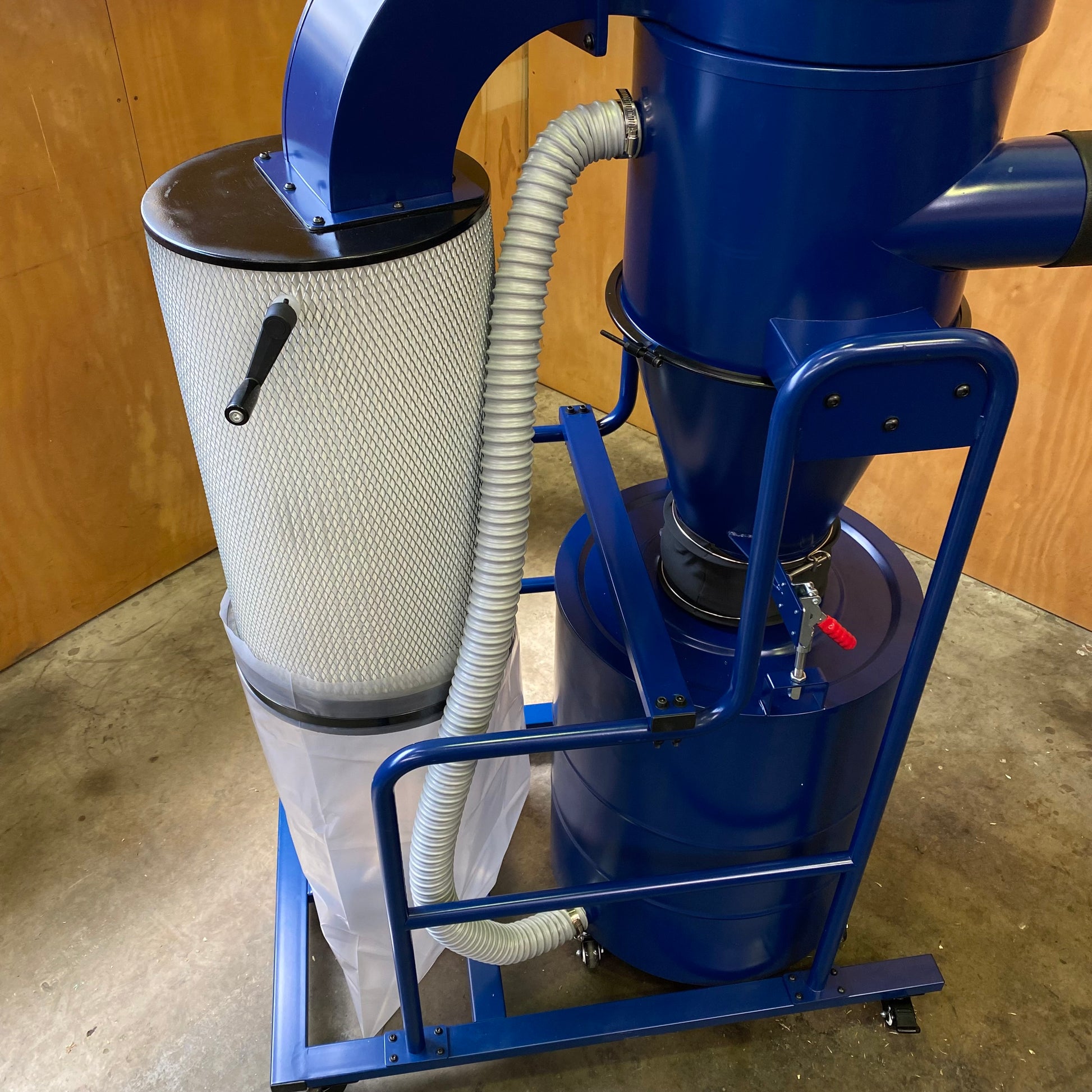 Carbatec CDC-650P 2-stage Cyclone Dust Collector The perfect replacement for your traditional 2HP bagged dust collector, with a compact base area, and superior performance. Two 100 mm (4") outlets or a single 125 mm (5") outlet, and all the efficiency you get from a well engineered two stage cyclonic separator. We have also included the unique choice of a bag, or bagless collection system. Reusable plastic bags in your collection drum are quick and convenient for waste disposal, but do become waste themselves at some point in the future. Mindful of your impact on our planet, we have designed our cyclone collector to run with or without these collection bags. Simply remove the integrated bag retention system and utilise the mobile drum itself as your collector. A cyclone dust collector works very differently to a traditional bagged type collector; A cyclone has separate impeller housing, attached to the top of a cone-shaped funnel. The sole purpose of the impeller is to create a high volume air flow, which is drawn through the cone, creating a higher pressure vortex (or cyclone) of incoming air. This fast spinning air within the funnel separates the heavier wood chips and large dust particles from the fine dust, causing them to drop into the collection drum below (Stage 1). The very fine dust, and the clean air, pass through or are collected by a very fine, pleated cartridge filter (Stage 2). This two-stage process of separating the material reduces the rate at which the filter will clog up. This reduced clogging allows more air through the collector system. Our standard cyclones are highly efficient at removing dust particles down as fine as 1 micron. Another advantage in this design is that the wood chips dont come into contact with the impeller (which would normally disrupt the airflow, dropping efficiency). This means that cyclones are often rated at lower CFMs (compared to traditional collectors), but the actual airflow and pressure in the dust network is kept running at its maximum for much longer. INTENDED USE:This dust collector is only intended for collecting wood dust and chips from woodworking machines. Do not use this dust collector to collect metal, dirt, pebbles, drywall, asbestos, lead paint, silica, liquids, aerosols, or any flammable, combustible, or hazardous materials. *Note: The diameter of the hose and complexity of your dust network can directly influence the performance of your dust collection system; Hoses that are too small in diameter, or too abruptly reduced from a large diameter, can result in poor air flow and potential blockages. Flexible hoses that are run over long distances will also result in poor air flow and dust can build up in the hoses. Changing hose sizes and lengths (increase or decrease) affects system air flow and static pressure in different ways. Changing corrugated or flexible hose, to smooth rigid ducting will have a positive effect on airflow efficiency. Consider one or all of these improvements: Shortening and limiting the runs of flexible hose (in favour of rigid ducting) can reduce your loss in air flow. Alter the layout of your workshop, so the heavy waste producers are closer to your collector. Step down your hose diameters gradually, and further away from the collector. This keeps a good balance between air flow and pressure. Avoid increasing hose diameters, as air flow, and pressure are both reduced.