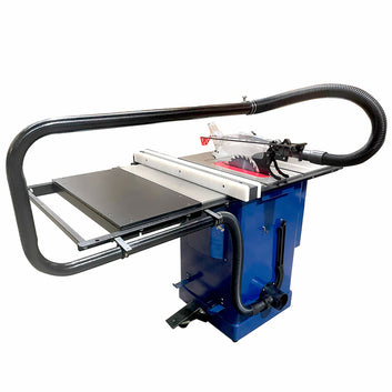The included overhead guard is clear providing great visibility during the cutting process. Further, this highly efficient guard offers suction right where the dust is being created - all channelled through a heavy steel integrated overhead piped dust system that comes standard with the machine. Inside the cabinet is shrouded and piped to a single rear dust outlet. That single 4" dust port connects to your dust extractor (not included!) and provides simultaneous dust extraction from above and below the table with exceptional efficiency! No separate Shop-Vac or specific reducers required.