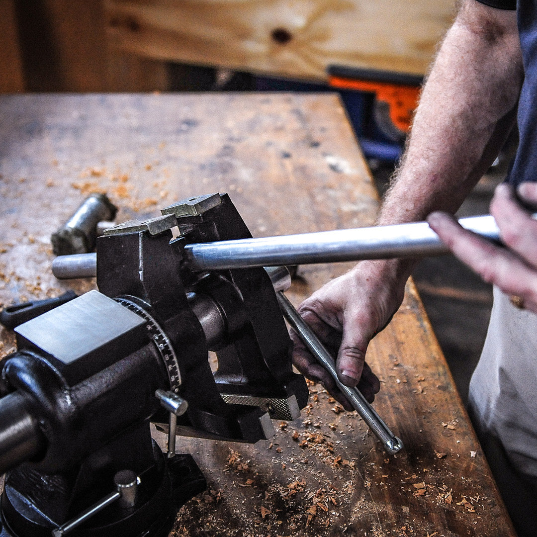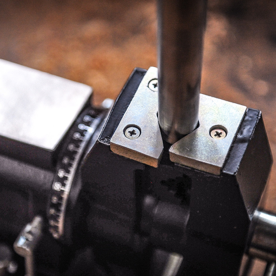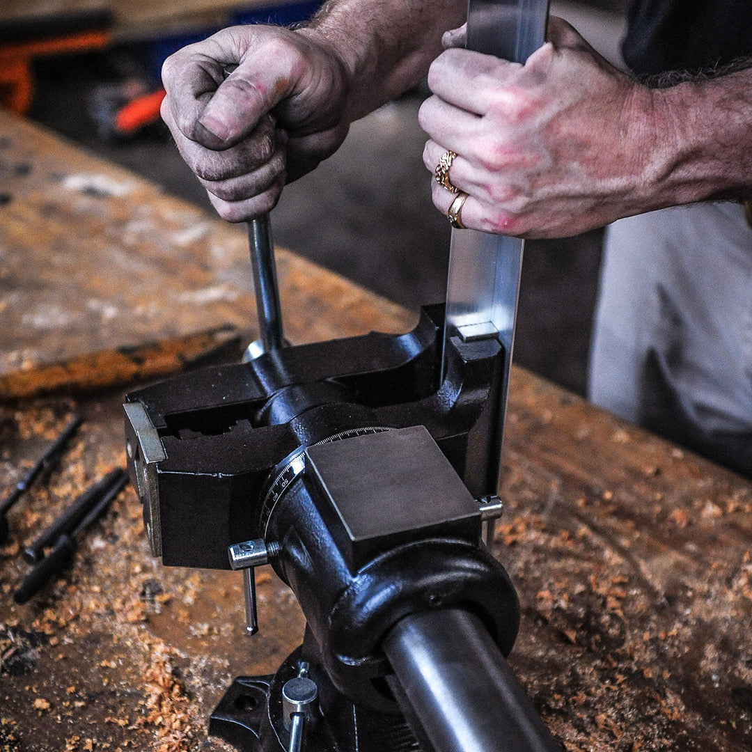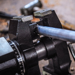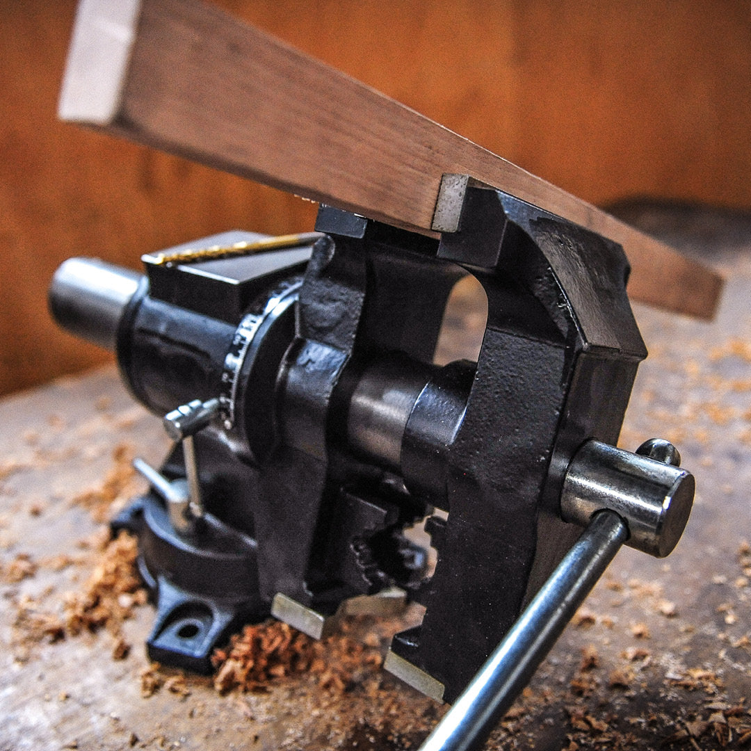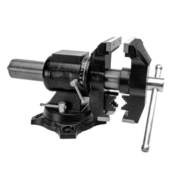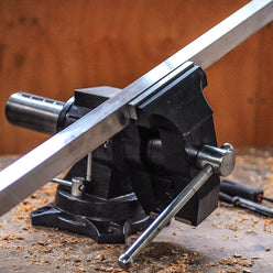 A full industrial, multi-function bench vice, with a swivelling and rotating head. Two different jaw arrangements, one side for clamping flats and angles, the other made specifically for tightly holding rounds and odd shapes. The head rotates to give you full control and access, and clamping your work, automatically clamps the vice pivot. Sturdy integrated anvil makes this a versatile and serious workhorse, in a compact size.