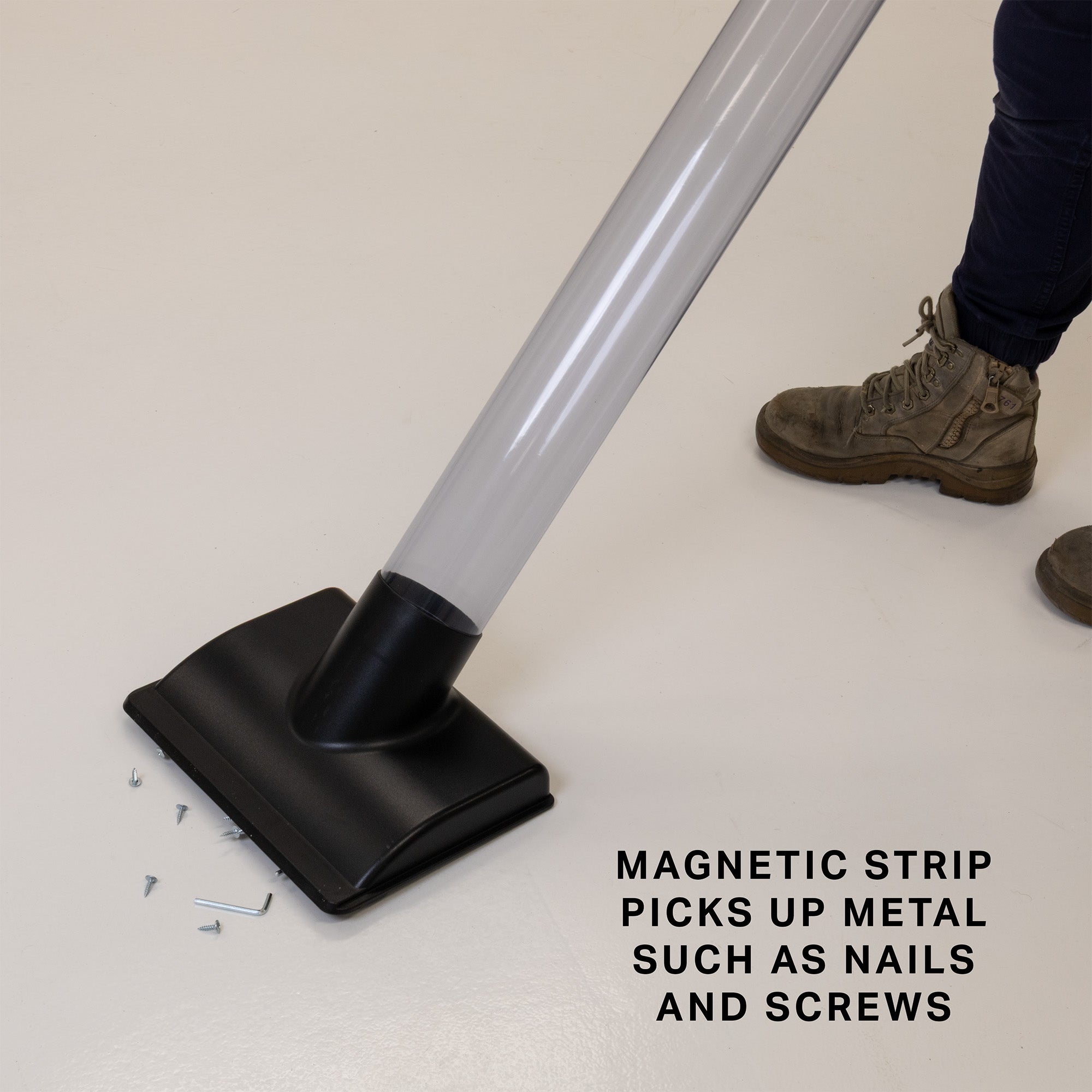 The Carbatec Magnetic Dust Hood is designed to integrate with 4" pipe and CT-VAC-11061 handles to form a traditional house vacuum type wand and handle system.The magnetic strip at the bottom of the head picks up and stops metal such as nails and screws to prevent them running through and damaging your existing dust extraction system.Ideal for running along the floor of your workshop to pick up any loose dust and wood shavings, this handy and compact head is an ideal addition to keeping your workshop clean, organised and ready to go to work.