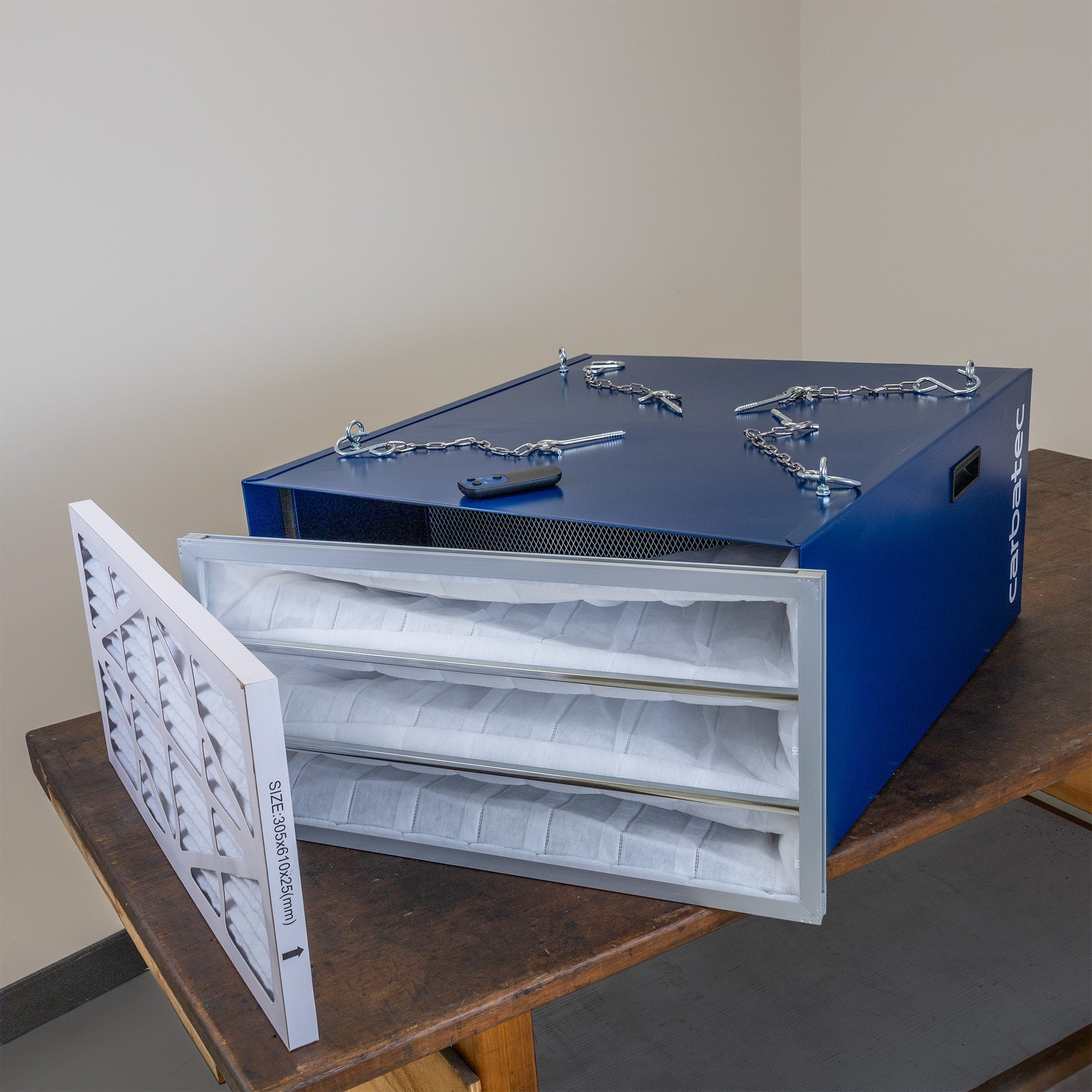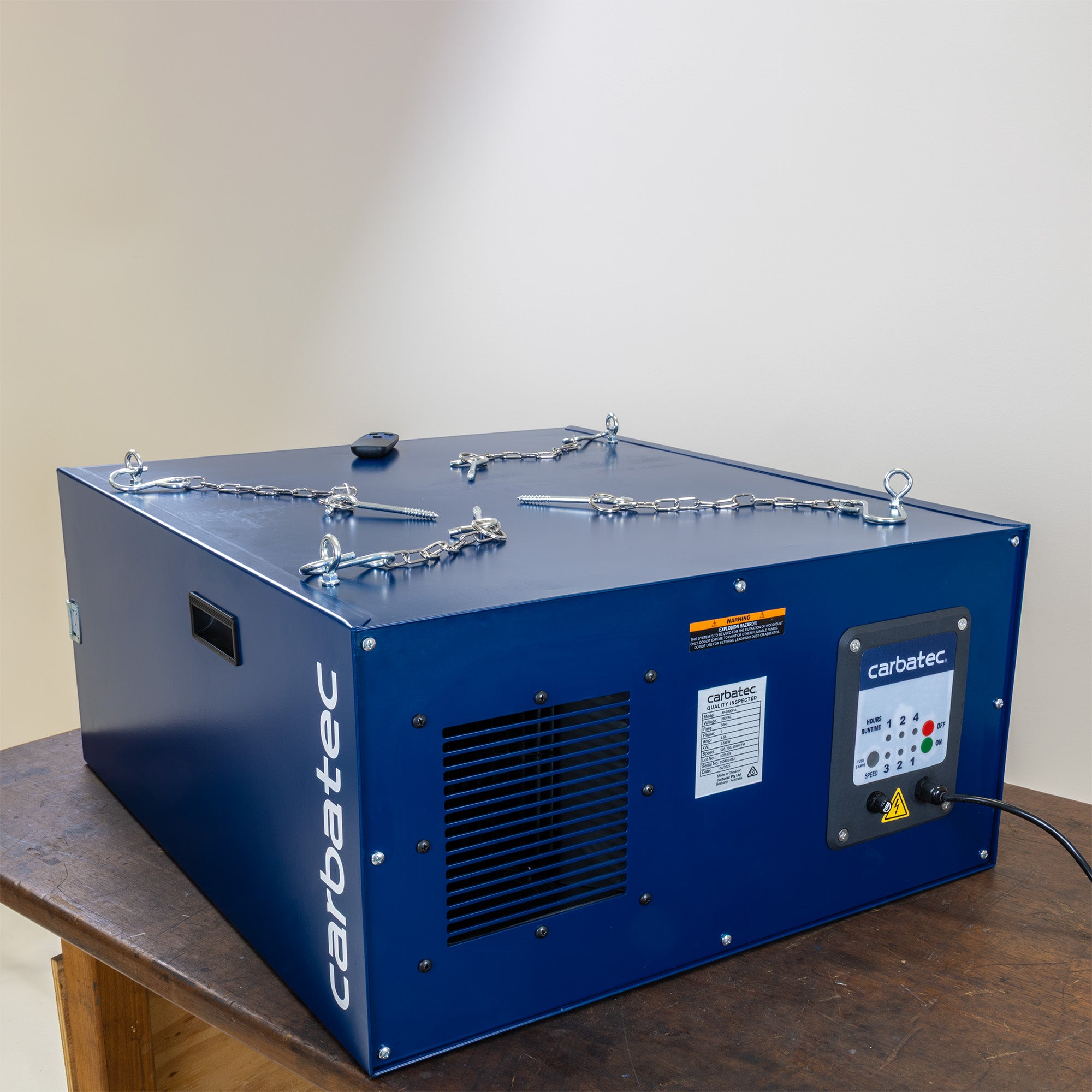 It is suitable for hanging from your ceiling, mounting on a wall, or placing on a stand or bench. Our AF-1000P 1/2 HP room air filter features remote control and variable extraction capacities of 560, 750, and 1100CFM. Adding more air filters increases your air filtration capacity.