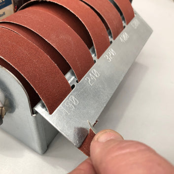An ideal accessory for woodturning spindle work, pen making and other applications where narrow sanding strips are an advantage. This kit contains 5 rolls of 25 mm x 6 metre sanding lengths with the following grits: 150G, 240G, 320G, 400G & 600G. Supplied in great dispenser box (with steel tear strip), this product also works perfectly with the Rockler Multi-Roll Sandpaper Dispenser (RK-55,374).