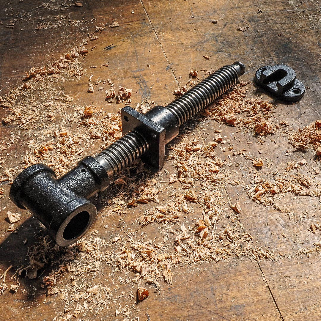 Shoulder vice hardware looks similar to a Tail vice, but is additional components allow it to be front mounted, and configured as an alternative to a front vice. Front vice hardware can sometimes be awkward to work around, especially when working on end grain. A shoulder Vice allows clear and positive clamping if flat pieces, against the flat front of your workbench, without the racking present in front vices. The improved design of these new bench hardware components is obvious, compared to many other on the market. More cast around the walls of the threads and support rails and much finer casting and finish will be sure to give you years of trouble-free use. Handlle and bench not included