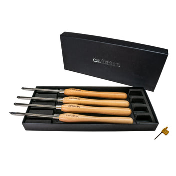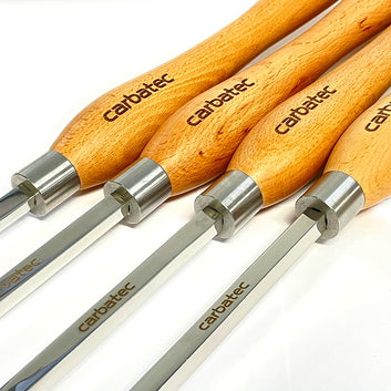 Take your woodturning to the next level with this premium 4-piece scraper set, designed for both general purpose and fine detail work on midi and full-size lathes. Featuring replaceable Tungsten Carbide cutters on solid stainless steel shafts, these tools offer exceptional control and a superior finish with less risk of catching. The European hardwood handles provide a comfortable and sturdy grip, giving you the confidence to tackle any project. These scrapers hold an edge far longer than traditional HSS tools, ensuring you spend more time turning and less time sharpening. Presented in a stylish black storage box, this set is the perfect step up for any passionate woodturner.