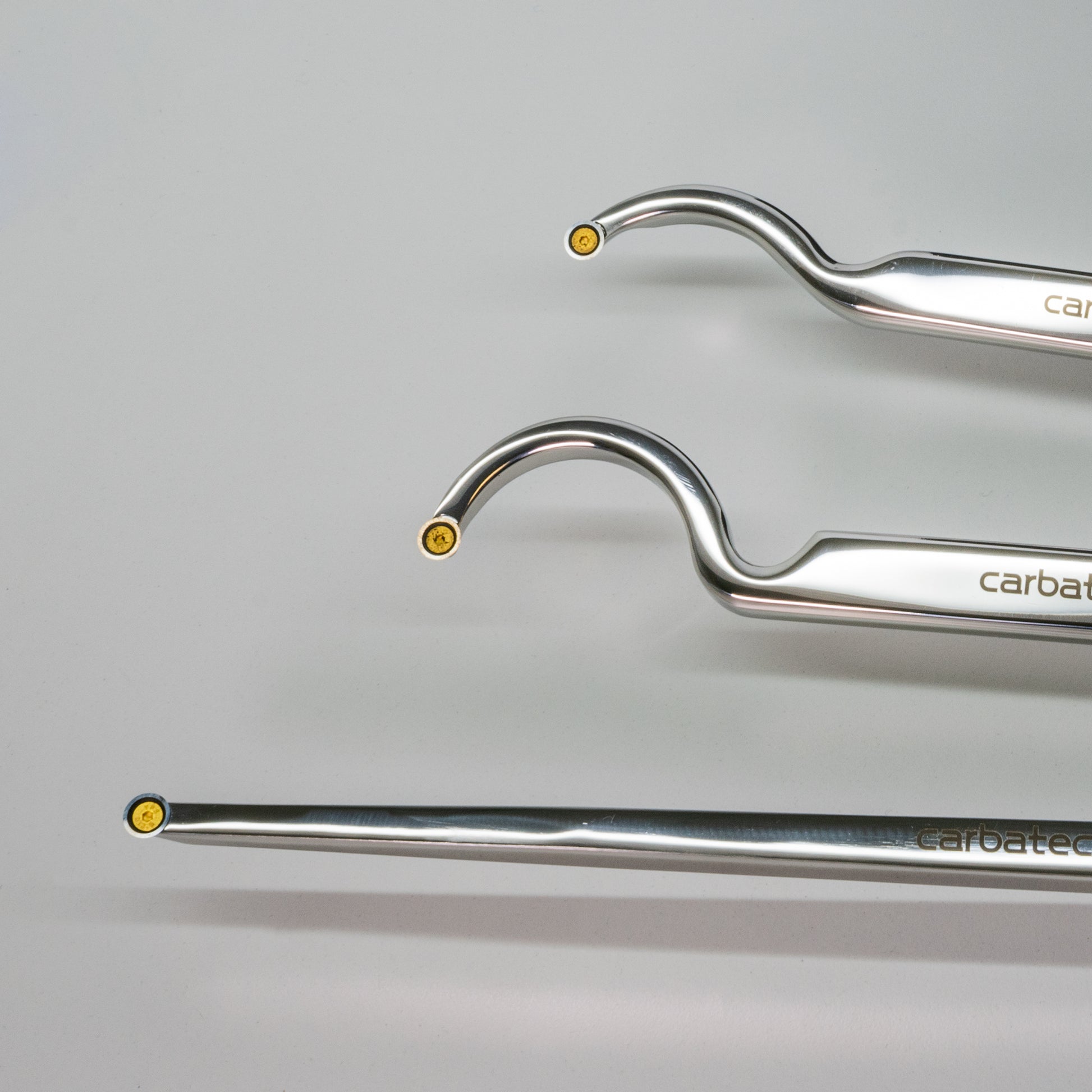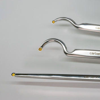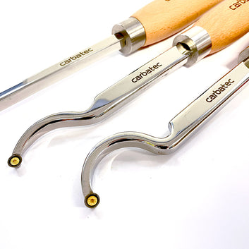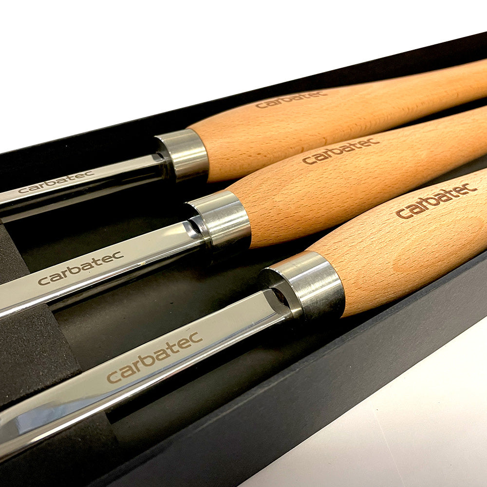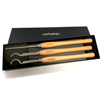 Introducing Carbatec's Next Level Woodturning Series!Our new Tungsten Carbide Tip Series sets are our offering in this very popular "replaceable tip scraper" tool style. All sets feature replaceable Tungsten Carbide cutters, mounted to Solid Stainless Steel shafts. These are coupled with Stainless Steel Ferrules and solid, smooth European Hardwood handles. They are even supplied in very 'giftable' black storage boxes, as shown. This 3 piece extra long set is specifically designed for deep hollowing work. The oversize shanks offer excellent support while projected well past the tool rest edge, as required in deep hollowing work. The extra long handles allow you to leverage the most balanced support required for such demanding work. The curved necks allow for undercutting of the lip often featured in this type of work. The Tungsten Carbide tips hold an edge far longer than HSS, and can be rotated for a clean sharp edge - then replaced when required. This set features 3 tools - one extra long straight and narrow tool for deep, tight spaces; one shallow swan-neck for initial undercutting or gentle inner curves; and one deep swan neck for deep undercuts. The Tungsten Tips on these tools are all round and 9 mm in diameter for detailed scraping. The shanks are laser etched, solid heavy and thick polished stainless flat bar and 175-210 mm in length, while the handles are also laser etched and 390 mm in length. If you want to step up from the basic beginner tools, these sets are for you. Incredible value for the quality.