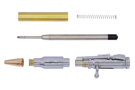 Chrome plated Rifle Bolt action Pen Kits (PEN-8,000 series). This completely cool and irresistibly fun pen will be hard for many hunting or target-shooting enthusiast to put down. Every detail, from the one of a kind bolt action mechanism to the precision engineered components, was carefully designed to ensure uniqueness and reliability. The realistic bolt-action handle smoothly advances and retracts to securely lock the refill in place. Note, Package sales as in single pack.