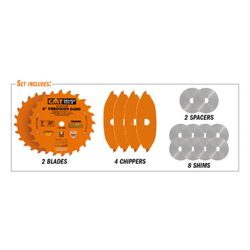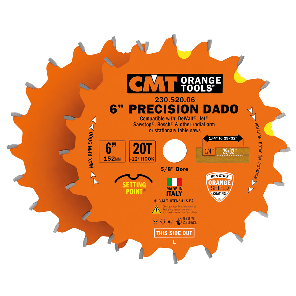 CMT thoroughly researched the shortcomings of standard dado sets and learned what cabinet makers required most from an ideal dado. The result was the superior CMT precision dado, designed with the following features: anti-kickback design to reduce the possibility of overfeeding that can occur when cutting mass material, splinter resistant cuts in veneer plywood, melamine and hard and soft woods.