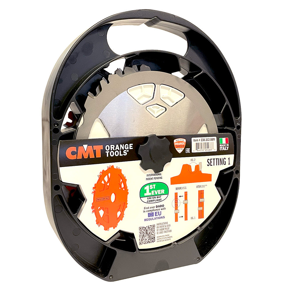 CMT is proud to introduce a brand new Dado Pro Set unlike any other! This is the very first Dado Set ever deemed UNI EN847 compliant. This means that while the Dado is rotating, the assembled elements will never come into contact with each other! This is possible thanks to unique blade body design and never before seen special lock spacers. The significance of this achievement is that this design is the first ever DADO stack in compliance with EU Regulations.While these regulations do not apply in Australia, this Italian made Dado set still represents a Premium option for any 30mm arbor table saw.FEATURES:- For flat bottom grooves virtually splinter-free cuts in solid wood, laminates melamines, veneer plywood.- Orange Shield Coating protect from heat, gumming and corrosion.- Includes 9 shims (plastic magnetic) and 3 x plastic lock spacers set for micro-thin adjustability.- Outer Main Left and Right Blades and 3 x Chipper Blades- Teeth feature an ATB + FTG grind with 20 ATB Pitch and -15 Rake