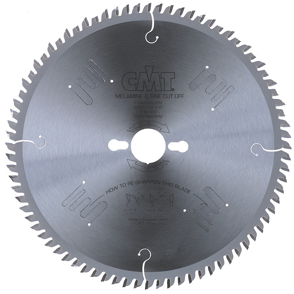 283.096.12M - Providing a perfect finish on both sides of double-sided laminated panels on materials such as solid wood, mouldings, melamine, laminates, veneered plywood, chipboard. Featuring a 30mm arbor, it is designed to fit radial arm saws, mitre saws, circular saws and tablesaws, with the use of a blade bush.