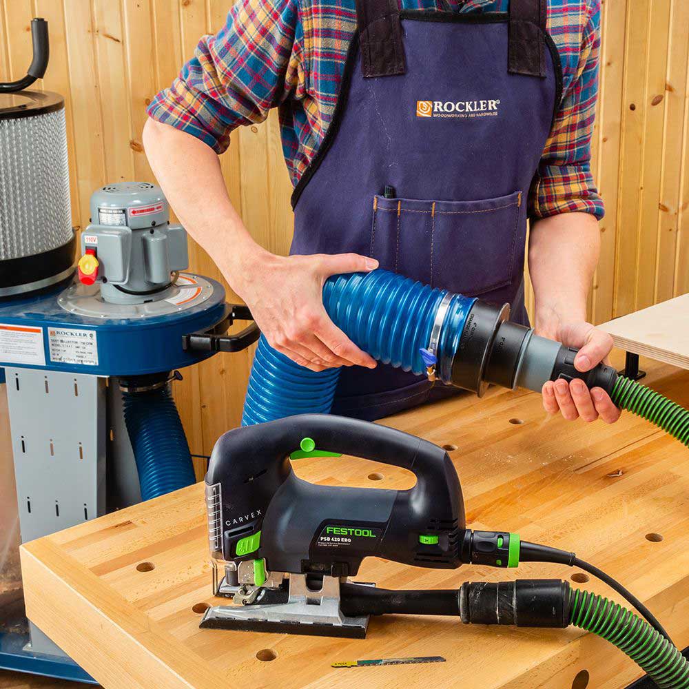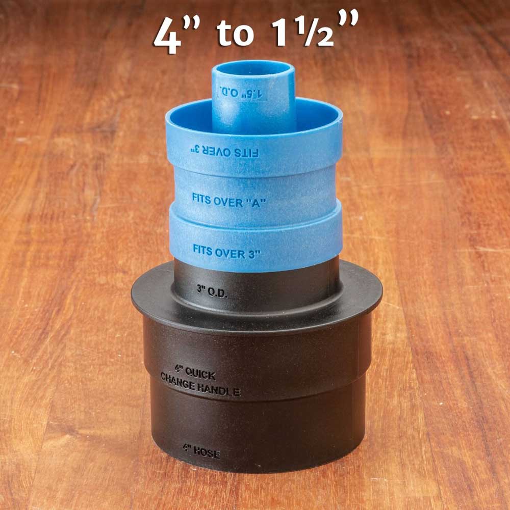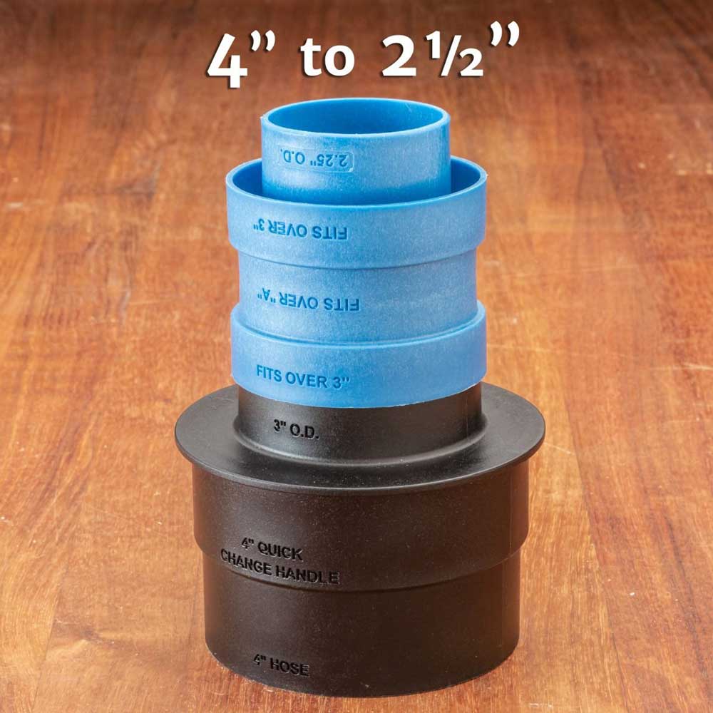Three interchangeable adapters can be combined five different ways for connecting different dust hoses and tools to dust collectionReduces 4'' hose/handle to 3'' OD, 2-1/2'' OD/2-1/4'' ID, 2-1/4'' OD/2'' ID, and 1-1/2'' OD/1-1/4'' IDBlack adapter fits 4'' hose or Dust Right 4'' Quick Change Handle (#55027, sold separately) on one end and has 3'' OD on the other endGray adapter fits into large adapter to step down from 4'' hose or Dust Right 4'' Quick Change Handle to 2-1/2'' OD / 2-1/4'' IDBlue adapter has 2-1/4'' OD / 2'' ID port on one end and 1-1/2'' OD / 1-1/4'' ID port on the other; it mounts either way to both the large and medium adapters to step down from 4'' hose or 2-1/2'' hoseDust hose adapters friction fit together for easy assembly or disassemblyMade from glass-reinforced polypropylene
