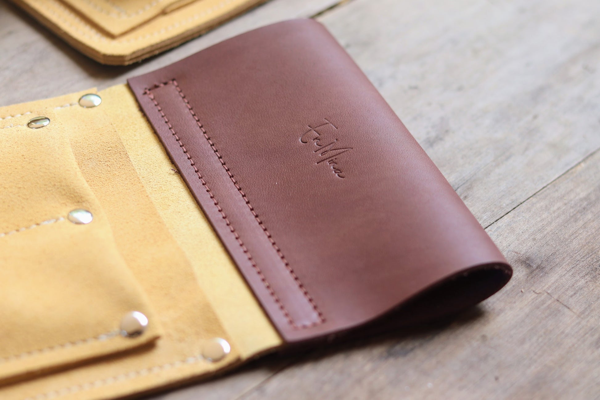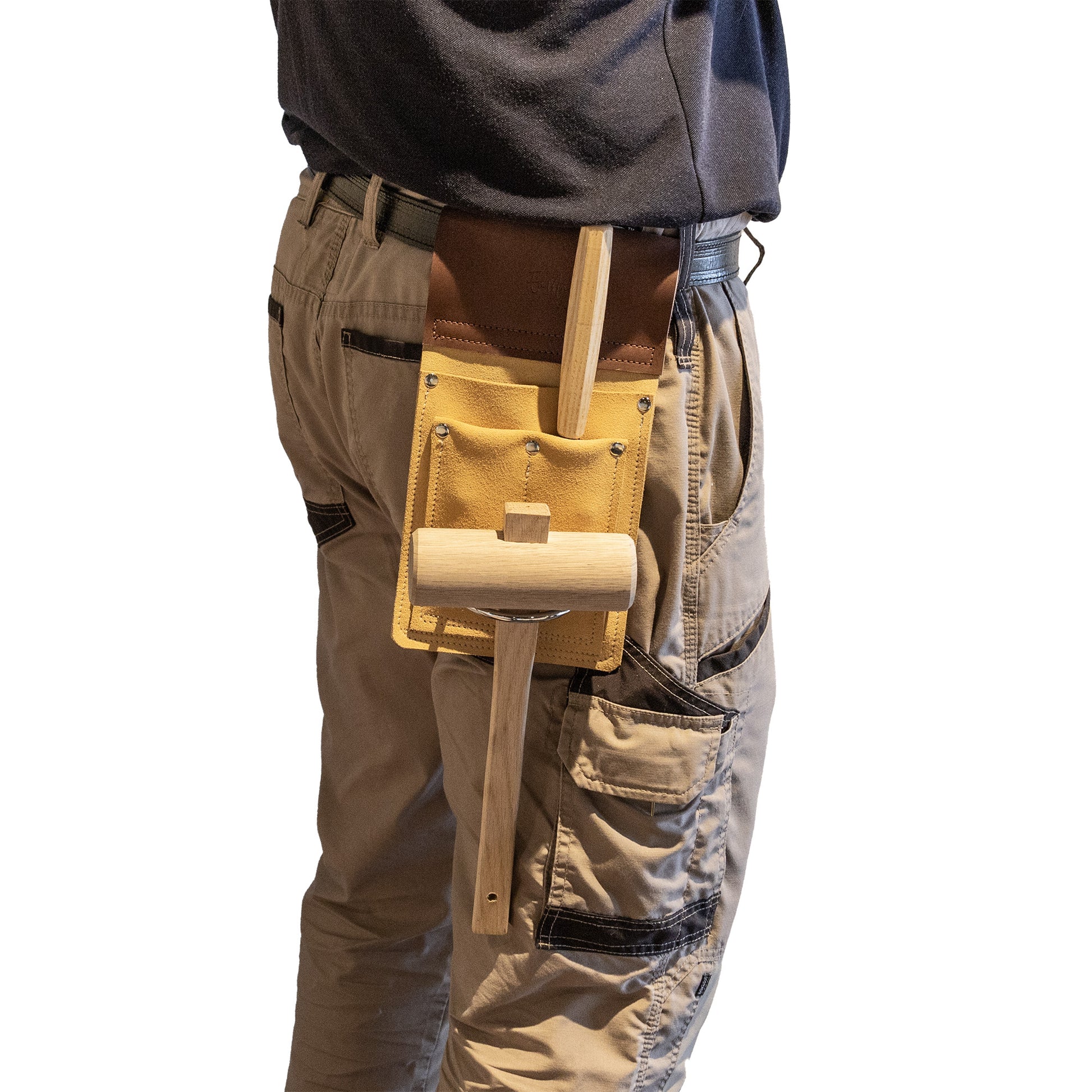 En Mina's handcrafted Hammer and Chisel holder is beautifully made from Australian cow suede leather. It is designed for woodworkers, builders, and makers alike!