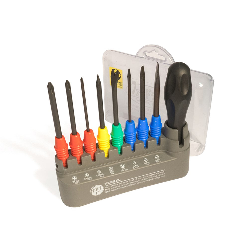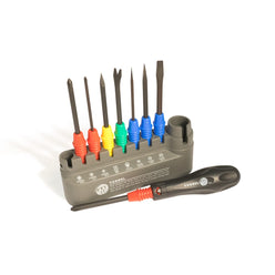 A driver set with an ergonomic handle and all of the driver bits needed for most fastening work. Driver bits are colour coded for convenience, and housed in sturdy stand with a clear top.