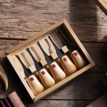 The Flexcut Beginner Palm Set set has three curved gouges, a v-tool and a skew chisel. Perfect for the beginning carver or an ideal choice for the seasoned carver who needs smaller tools for more detailed; controlled work. Set is comprised of five 125mm tools: No. 2 x 10mm gouge, No. 6 10mm gouge, 3mm veiner, 6mm x 80degree v-tool and 8mm skew.
