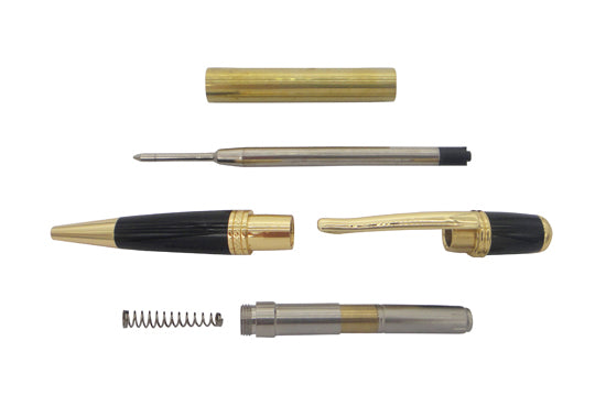 Gold plated with combination of Black Chrome Twist Pen Kit exhibits mystery, flair and elegance. With its streamlined look, striking black components and smooth twist mechanism it will surely compliment any executive's desk. Accepts Parker style ball point refills, easy to make with a single tube. Plus, the plating offers a bright pure gold colour that will give your project a rich and luxurious look. Note, Package sales as in single pack.