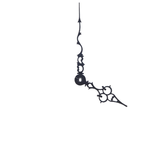Black hour and minute hands to suit our American made clock movements. The option to include a second hand is left up to the individual, as is the self adhesive Roman Numerals (I, IV, XII) or Arabic Numerals (1, 4, 12). Length of minute hand: 111 mm Length of hour hand: 80 mm
