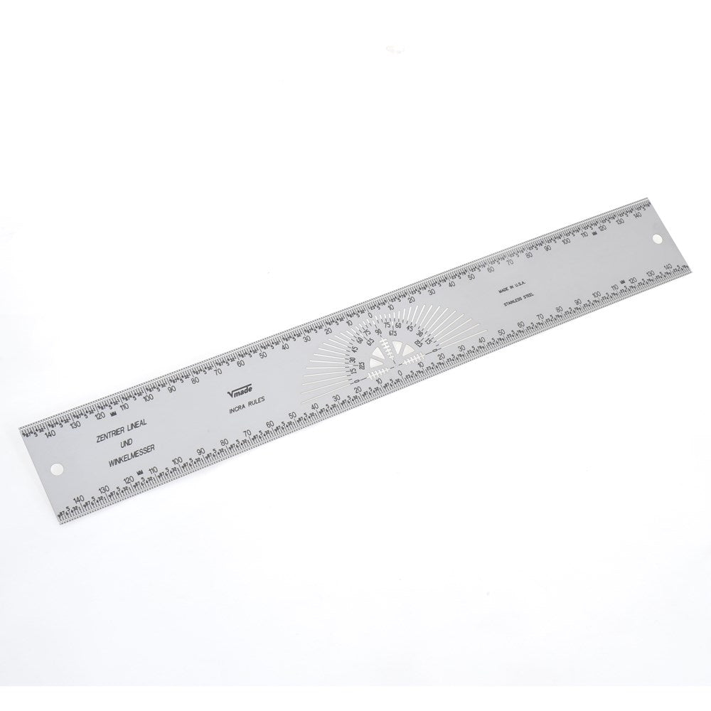 Find the exact centre of any work piece up to 300mm wide. In addition to top and bottom micro-fine marking holes at every 1mm it also has a built-in protractor with guide slots at every 45°, 30°, 22.5° and 5° interval.