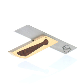 Ironbark Tools are individually handcrafted and feature Australian "Arid Zone" hardwoods in Brisbane, Australia.Quality squares are synonymous with quality woodworking. These squares are made from a solid 19mm x 16mm block of milled and machined brass, accented by a through 'keyhole' design with a solid timber insert. The species used in this case is 'Yarran' - Acacia homalophylla. This is an Australian 'arid zone' species, commonly called 'desert or outback' hardwoods, that weighs around 1275kg/m3. A hard-wearing, heavy and dense species, it is perfectly suited to the task, and its commonly dark brown tones contrast beautifully against the brass and steel.Critical to the design, the 19mm wide and 3mm thick milled 304-grade stainless steel blade/beam is adjustable - meaning that while it is set to 45˚ on completion, in time, the square can be recalibrated and adjusted for perfect angle throughout a lifetime of use. A laser-engraved Ironbark logo completes the beam.The feel and weight of these tools make them a pleasure to use and, ultimately, are an investment in the quality of your woodwork. Every workshop needs a square, and every woodworker will appreciate a quality, uniquely Australian handcrafted tool.The 45˚ Mitre Squares are available separately in two sizes: 4" (102mm) and 6" (152mm), referring to the blade/beam length.The stainless steel blade requires little maintenance, while brass tarnishes and develops a natural patina. This does not impact the function of the tool, and some prefer the naturally aged look, but it can be protected, maintained or restored with a little #0000 steel wool and furniture wax if you prefer a polished brass finish.About the maker - Passion for the woodworking industry, an eye for detail, and an appreciation of quality tools led Devon down a path of fine woodwork and working with many established names and businesses in the field. The culmination of this path eventually led to a desire to handcraft the tools required, and Ironbark Tools was established. Now displaying a range of tools at events throughout Australia and the USA, Devon is continually refining his craft and developing novel features in his tools, utilising a range of Australian and, occasionally, exotic timbers.NB*: This offering is for the 4" (102mm) mitre square only. The 6" (152mm) is available separately.