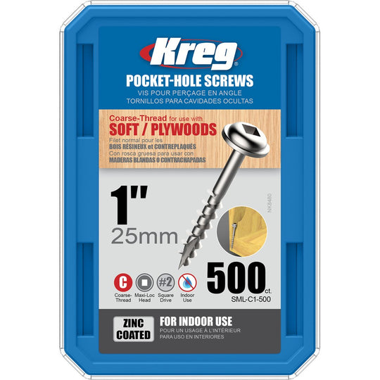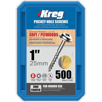 Zinc screws are recommended for a wide variety of indoor projects where moisture is not a concern. Coarse thread screws are used with softwoods - as well as plywood, particle board and MDF. Maxi-Loc Kreg Screws have a large head that provides maximum bearing surface as the screw pulls tight in the pocket.