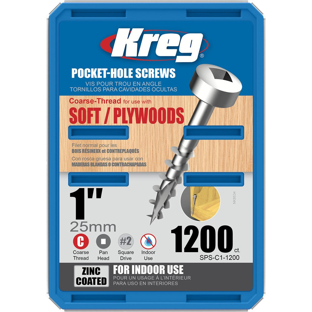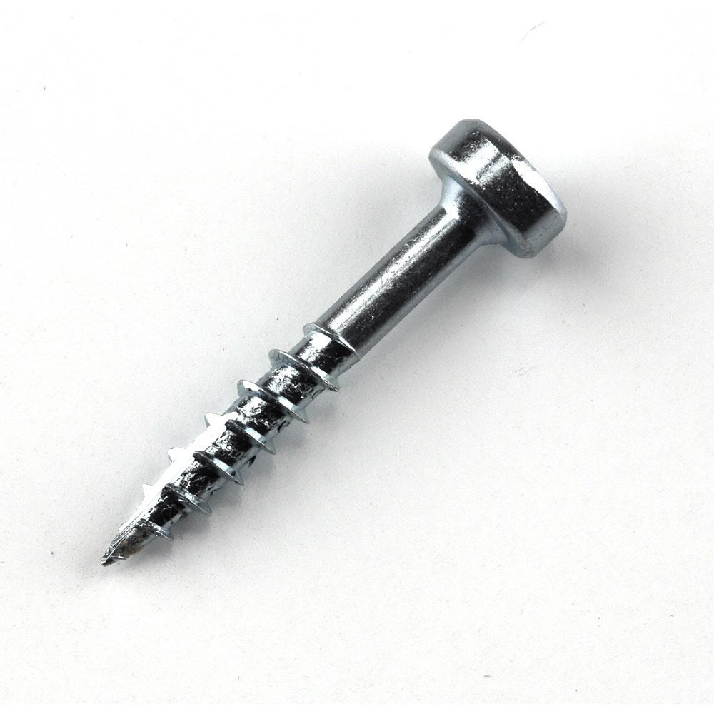 Zinc screws are recommended for a wide variety of indoor projects where moisture is not a concern. Coarse thread screws are used with softwoods - as well as plywood, particle board and MDF. Pan-Head screws have a smaller head allowing them to fit places where space is limited and/or tight pocket-hole spacing is desired.