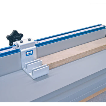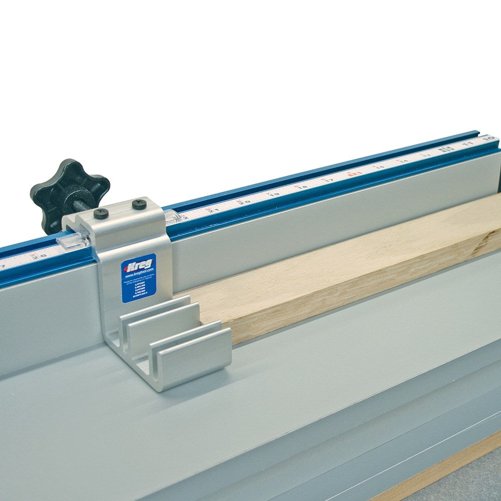 Repeatability is often the key to woodwork, getting the same size components consistently without change. The Kreg Production Stop can do just this when using setups with machines such as mitre saw station, router table, or table drill press or even radial arm saw. It is a fixed stop with a red hairline indicator to ensure accurate readings against the measuring tape.