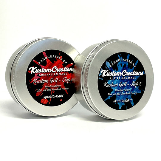 This set contains 1 x 170ml Tin of Kustom Grit Step 1 and 1 x 170ml Tin of Kustom Grit Step 2.