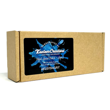Kustom High Speed Polish is a food grade low allergenic buffing/ polishing compound for use with any kind of buffing system, that can also be used as a friction polish.Like the Kustom Grit range, it is available in two "steps", rated at #50'000 and #100'000 grit respectively, but unlike the Grit pastes in this case, is formulated into a hard set bar. The large bars are 200 grams each and represent the best bang for buck. They are the most appropriate size for applying to powered buffing wheels/buffing systems. Also available in a smaller bar, great for trying the product, or use as a friction polish or strop compound, as below.Great for polishing virtually anything you want to polish on a buffing wheel - metals, timber, other hard finishes - anything you would normally use a buffing wheel for.Additionally, Kustom High Speed Polish can be used as a "friction" polish, applied directly to lathe work. Apply by pressing the bar against your piece while running, or while off, draw on like a crayon, then use a fine cloth to melt and buff the finish while turning! Perfect for acrylic, resin or timber pens and many other projects. Leaves a long lasting and hard wearing high polish.So versatile, it can also be applied to leather strops for honing your tools!Colour coded labels assist in identifying the correct grit quickly: Red = Step 1; Blue = Step 2 and this is carried across other products in the Kustom Range.TIP - the bar is cast with the Step 1 or 2 into the mould. Using it from the back and opposite end to the number means you will always know which bar to put in which box after use - right up until you need to replace it!