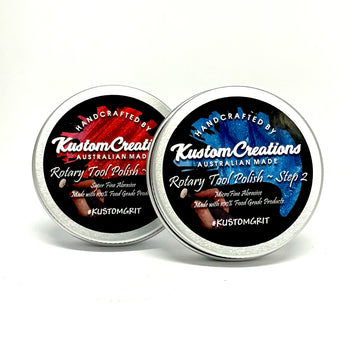 These are the ultimate polishes for Jewellers, Netsuke masters or anywhere small detailed pieces need to be polished! Formulated with a hard set making it stable at high speeds, use these polishes with the various shaped buffing heads available for Dremel® Tools, Archer Power Grinders, Foredom® Tools and similar detail powered rotary tools. Can be used on metals, timbers, plastics, resins and more. Leaves a long lasting and hard wearing high gloss polish.This two piece set contains 1 x 40g Tin of Step #1 (50'000 grit) and 1 x 40g Tin of Step 2 (#100'000 grit).Food grade, non-toxic, non dangerous goods, low allergenic (no colours or frangrances).