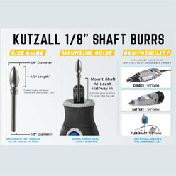 Kutzall burrs are designed to excel where conventional rotary tools struggle, delivering fast material removal with outstanding surface control. Proudly made in the USA, these burrs are engineered for exceptional wear life, smooth cutting action, and resistance to loading, allowing you to work effortlessly with or against the grain.