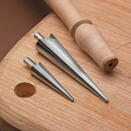 First-time Windsor chairmakers will find the large reamer (3/16" to 1 3/16") indispensable for tapering leg sockets. The bits are 3 3/8" and 5 1/2" overall respectively with a 5/16" hex shank. The included angle of 12.8° on both reamer bodies matches the tenons made with the Veritas Tapered Tenon Cutters.