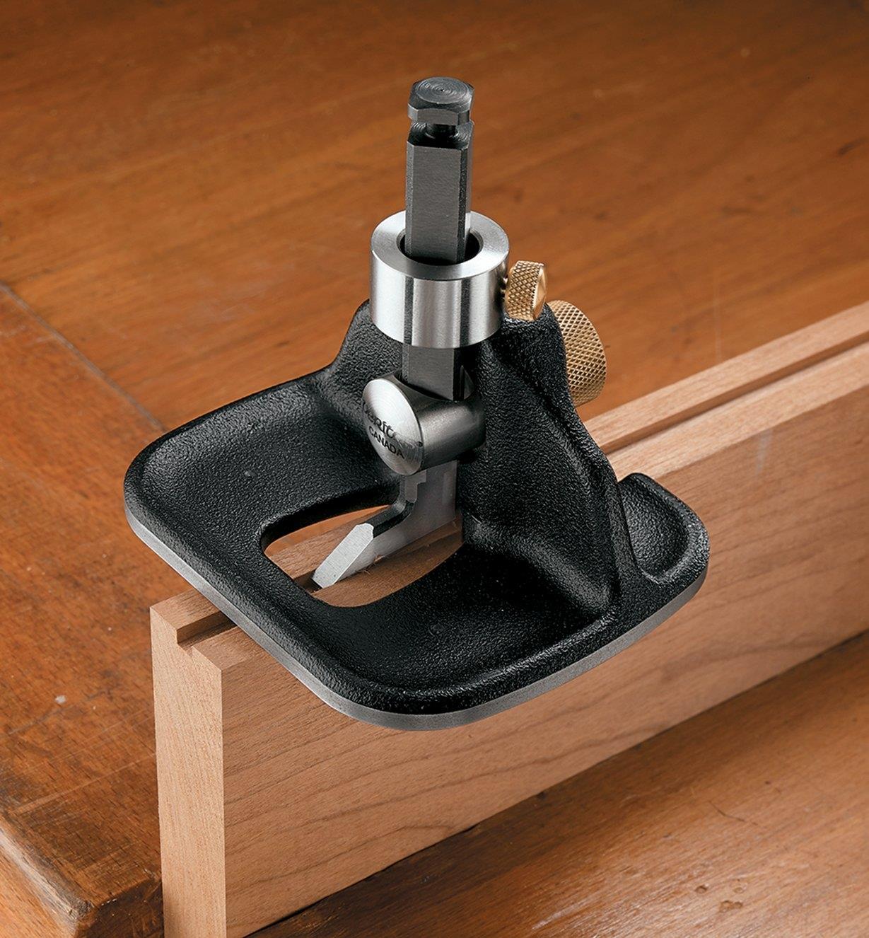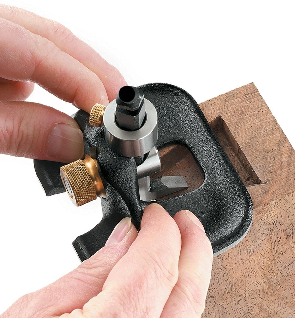 An included stainless-steel depth-stop collar locks onto the blade shaft to limit cutting depth to a preset maximum. The plane can make cuts up to 1" deep with the depth stop installed or up to 1 3/4" deep without it. The ductile cast iron body has been accurately machined and ground flat. The plane is 3 1/2" wide by 3" deep and weighs about 13 oz. A versatile plane, particularly on narrow material or in confined areas.Made in Canada.