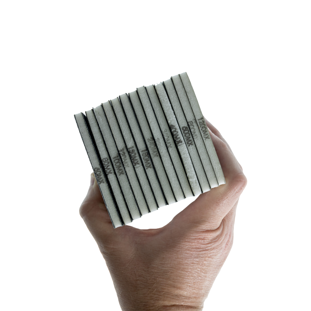 Each pad is colour-coded, with the same grade on both sides, and can be rinsed, dried, and reused—ensuring great value over time. The assortment set covers the complete Micro-Mesh MX grading system, ranging from coarse 60MX through to ultra-fine 1200MX. This makes them suitable for everything from initial shaping through to achieving a polished, high-gloss finish.