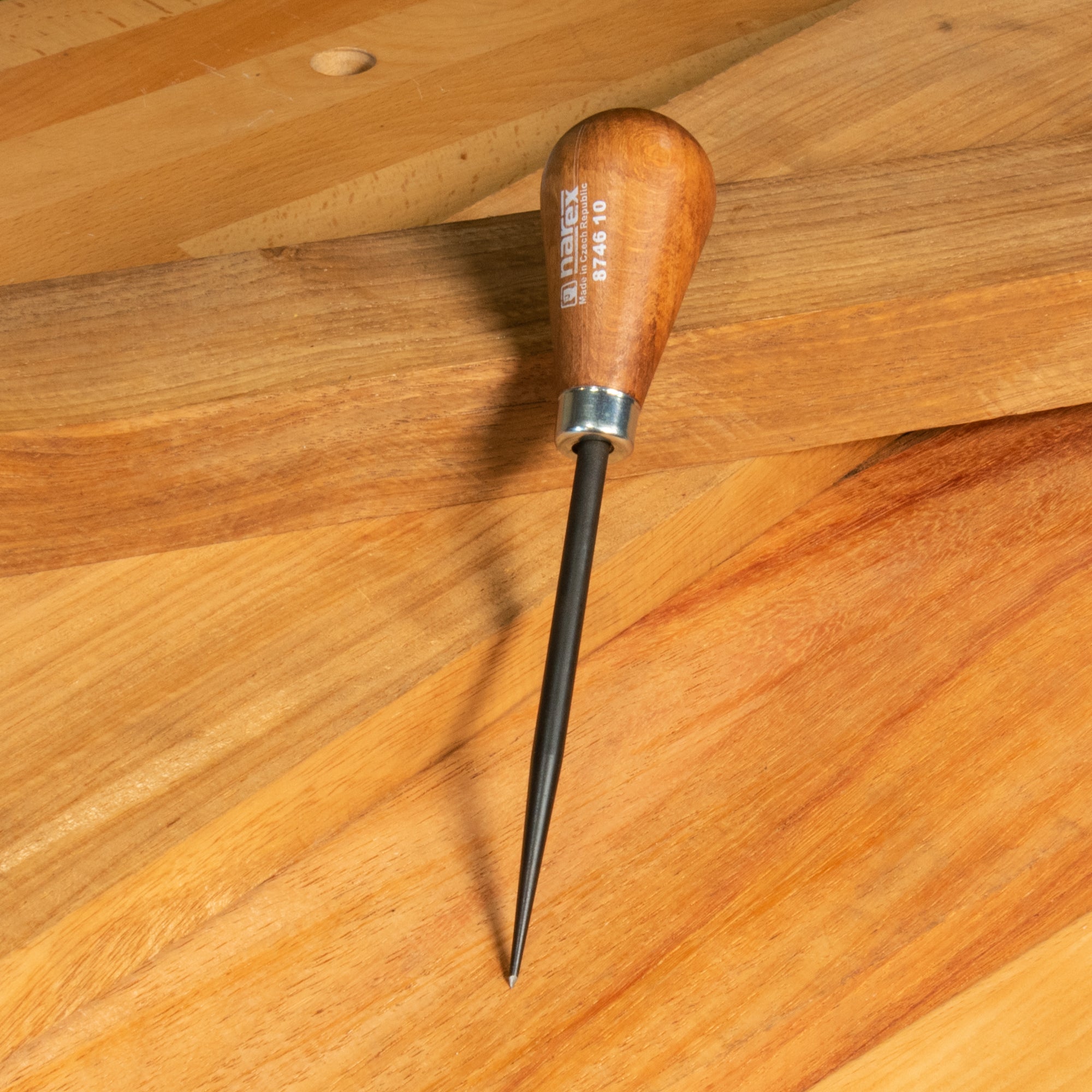 Scratch awls are used for a variety of different marking out tasks from scribed lines to centre punching. A very useful workshop tool.This awl has a circular cross section and is made of Cr-V Steel with a hardwood handle.The shaft is 6mm in diameter at full width while the total length is 164mm.