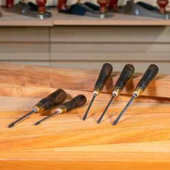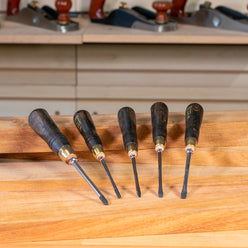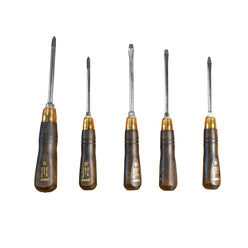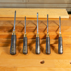 A beautiful and high quality traditional timber and brass screwdriver set, consisting of three sizes of flat blades, along with two cross or Philips head drivers - covering the most common sizes required.