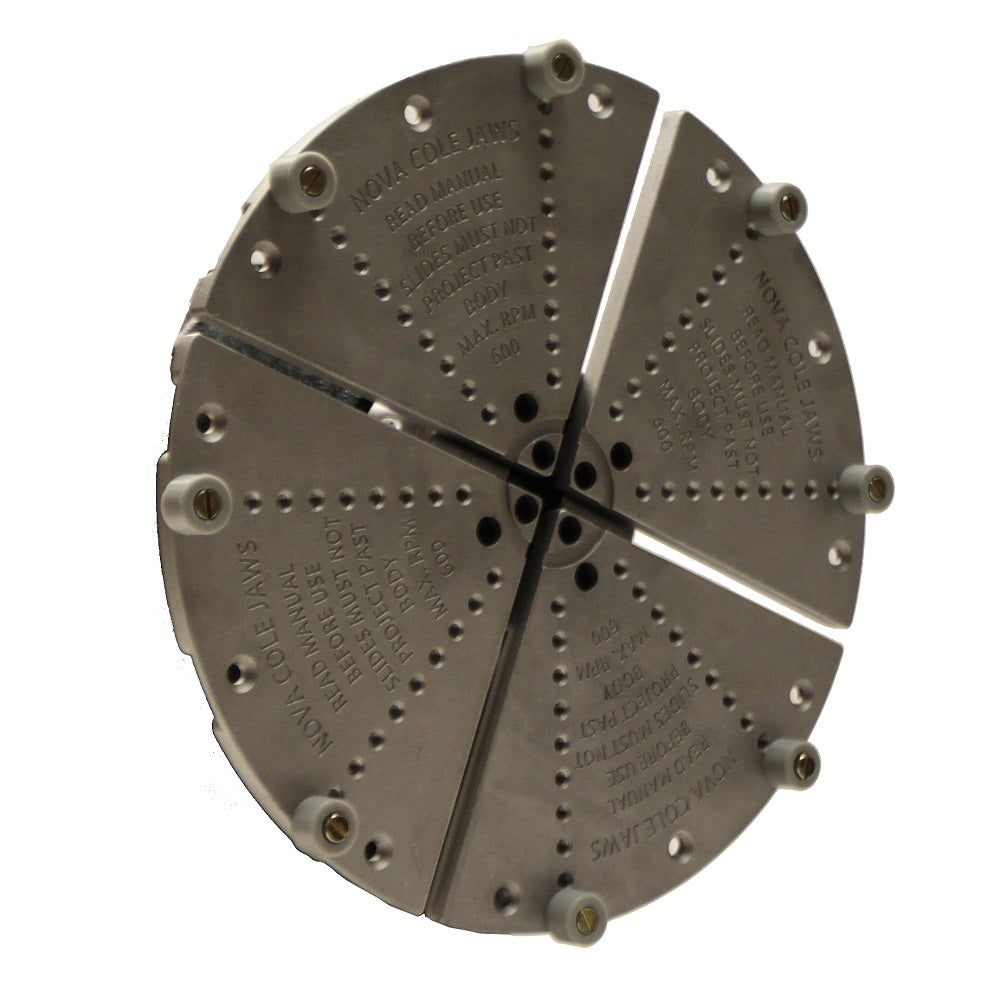 The NOVA Large Cole Jaw Set is 12"/305mm in diameter. The NOVA 6040 Large Cole Jaw Set has been designed for the re-chucking of bowls to remove chuck marks, add decoration or to re-shape the bottoms of bowls that have already been turned. NOVA Large Cole Jaws are suitable for lathes with a minimum 14inch/350mm swing diameter and can be customised with false wooden jaws. See TK-JSCOLE for a smaller 10" Cole Jaw option, suited to lathes with a 12" minimum swing, or the TK-6006 Mini 8" Cole Jaw set, for lathes with a minimum 10" swing.Includes: